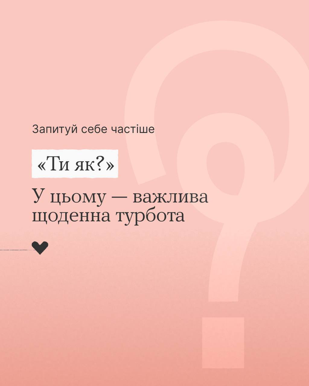Звірятися з собою та своїми відчуттями — це не слабкість, а ознака сили та самопізнання. Це прояв турботи про себе, яку ви можете собі дати, особливо коли уваги від оточуючих не вистачає. Вміння чути себе, розуміти свої потреби та емоції є ключовим для підтримки ментального здоров’я. Воно дозволяє нам ефективніше справлятися зі стресом, будувати здорові стосунки та досягати особистісного зростання. Фахівці програми ментального здоров’я «Ти як?» пропонують практичні поради, як навчитися слухати себе та свої внутрішні сигнали. Ці поради, представлені у зручному форматі каруселі, допоможуть вам розвинути навичку самоусвідомлення. Розуміння власних потреб є фундаментом для психологічної стійкості. Це дозволяє нам бути більш автентичними та жити в гармонії з собою. Навчання саморефлексії — це інвестиція у власне благополуччя, яка окупиться сторицею. Не бійтеся звертати увагу на свої почуття, адже саме вони є компасом, що вказує шлях до справжнього щастя та задоволення життям. Дозвольте собі бути уважними до свого внутрішнього світу, адже це найцінніший ресурс, який у вас є. Розвивайте цю навичку, і ви побачите, як позитивно це вплине на всі сфери вашого життя. Гортайте карусель, щоб дізнатися більше про те, як налагодити зв’язок із собою. #тияк
