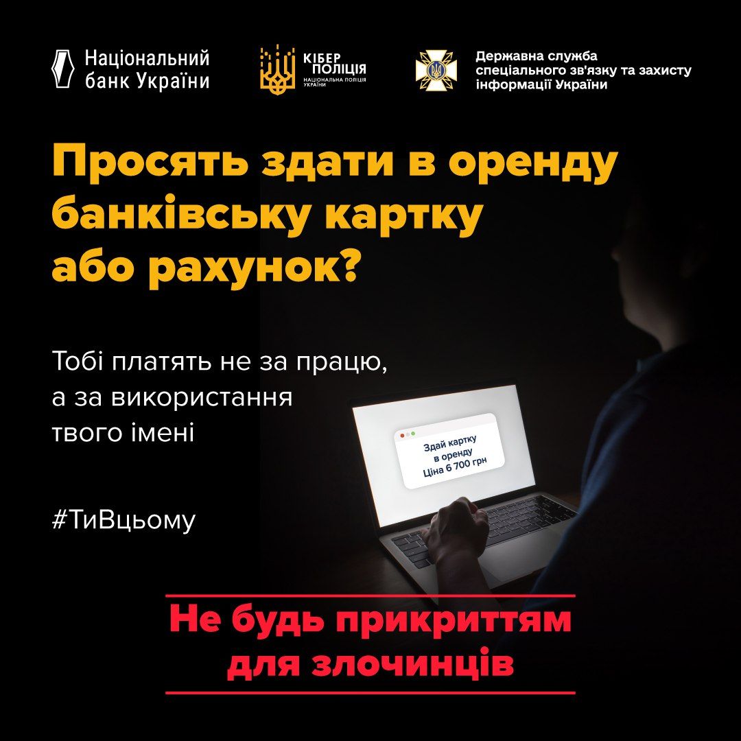 Здаючи свою картку в оренду, ви можете думати, що просто підзаробляєте. Але насправді ви можете стати частиною злочинної схеми. Вашу картку можуть використовувати для протиправних дій, і ви станете співучасником, навіть якщо думаєте, що просто допомагаєте. Пам’ятайте, вам платять не за роботу, а за доступ до вашого імені. Це не підробіток – це кримінальна пастка!
