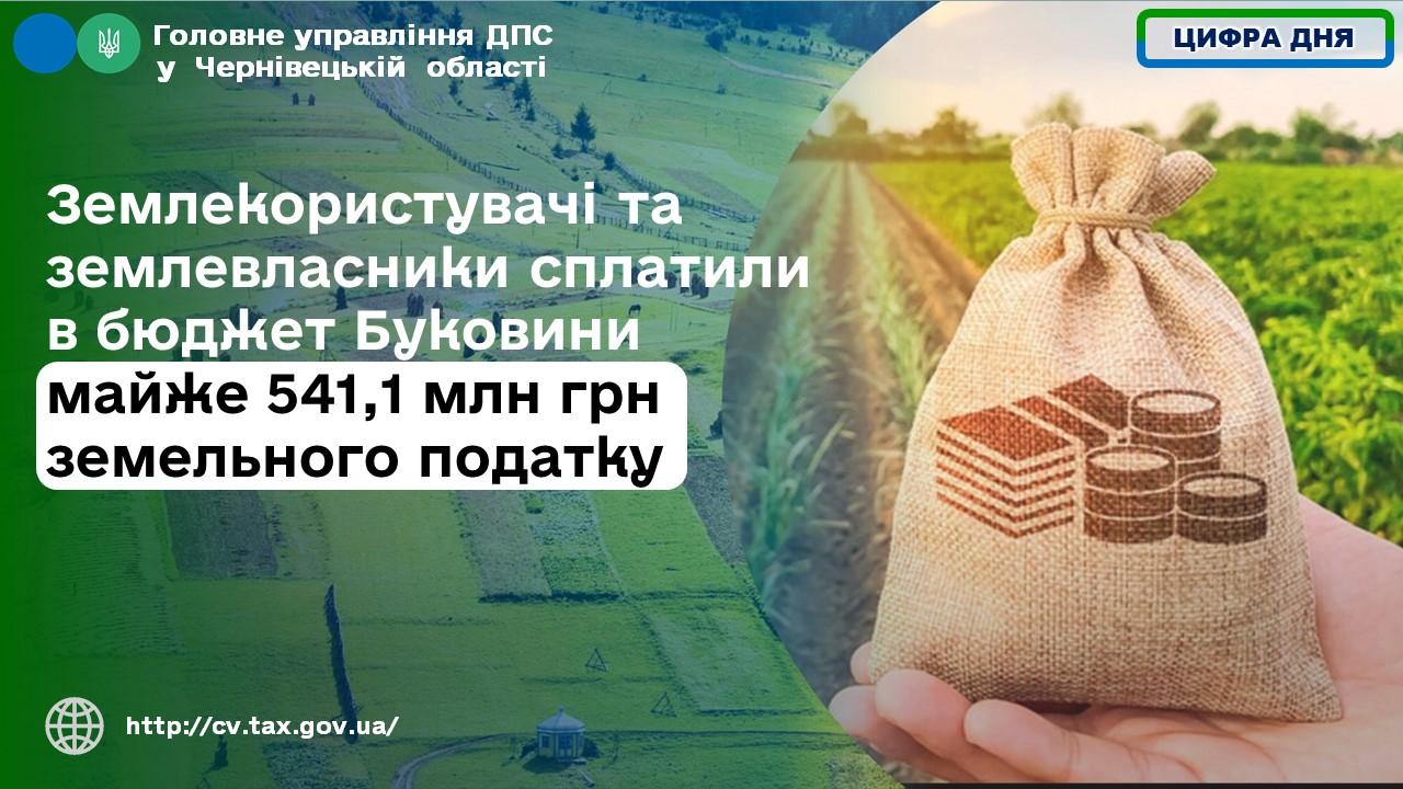 Землекористувачі та землевласники Буковини сплатили майже 541,1 млн грн земельного податку