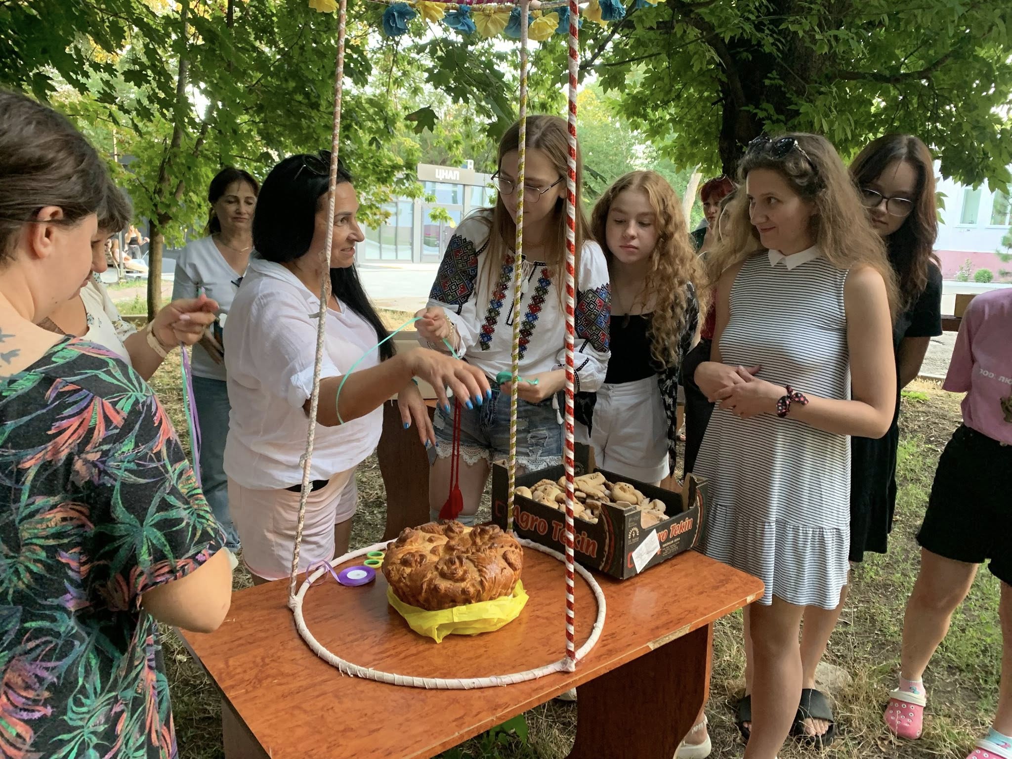 Разом із учасниками обміну ми розвісили «дівування» на каркас та встановили «парубкування» в коровай, доповнивши композицію яскравими паперовими квітами 🌺.