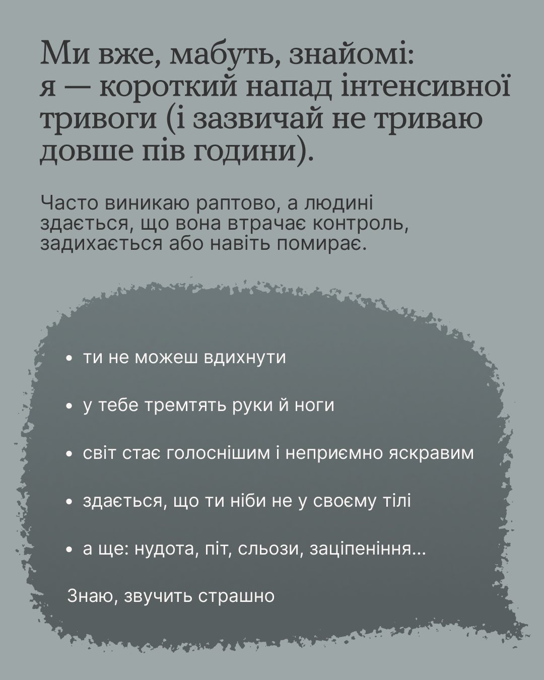 Панічна атака – це не просто сильний страх, а раптовий, інтенсивний напад тривоги, що часто супроводжується фізичними симптомами, які можуть відчуватися загрозливими. Хоча зустріч із нею не є приємною, вкрай важливо розуміти, що сама по собі панічна атака не становить загрози для життя. Це радше потужний, але тимчасовий сигнал організму, який не можна ігнорувати. Вона виникає несподівано і може досягати свого піку за лічені хвилини, змушуючи людину відчувати повну втрату контролю.