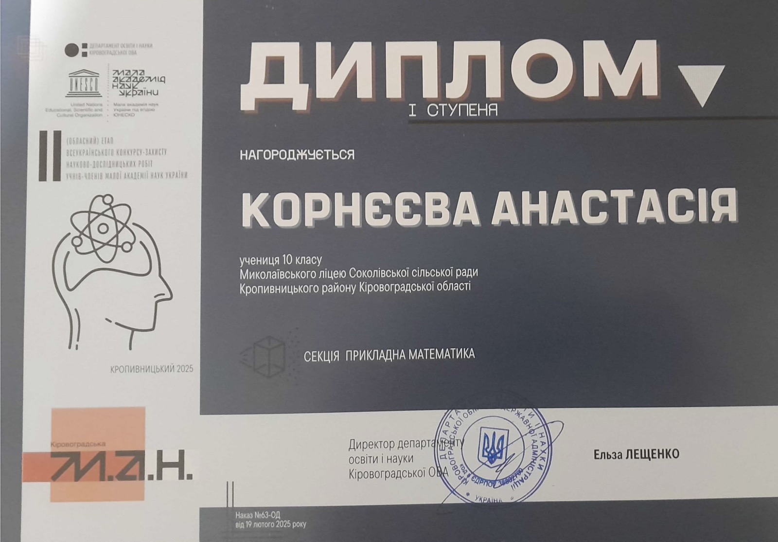 Ця перемога є знаковою подією для всієї Соколівської громади та надихає інших учнів на наукові пошуки та досягнення. Ми віримо, що Анастасія Корнєєва стане успішним науковцем і зробить значний внесок у розвиток науки в Україні.