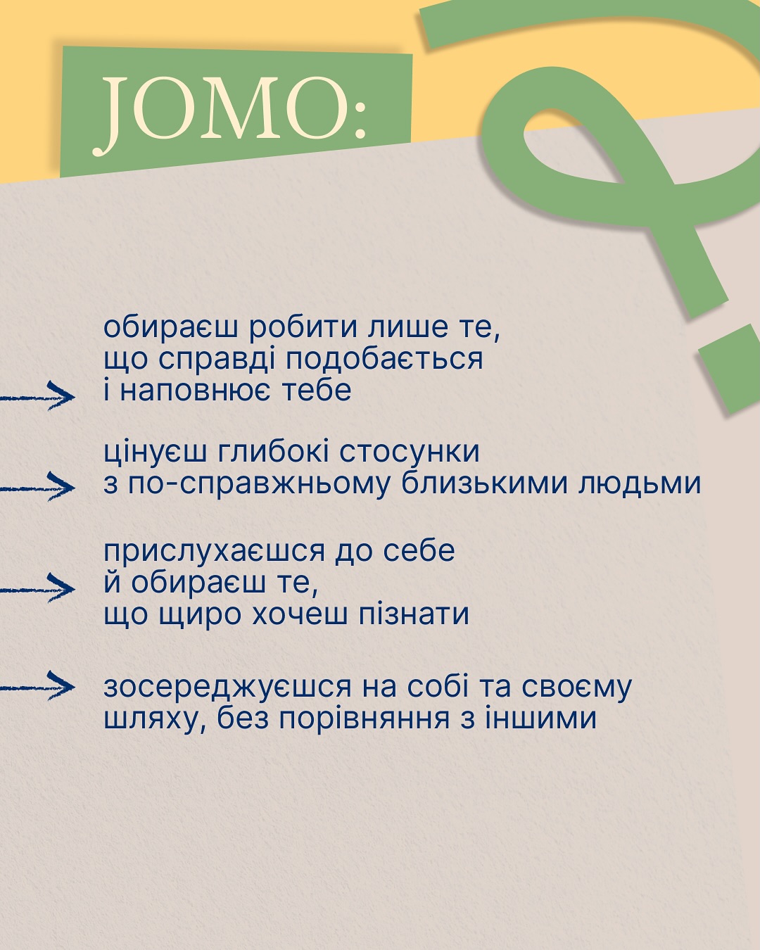 З англійської Joy of Missing out (JOMO) вчить отримувати задоволення від того, що ти свідомо відмовляєшся від можливостей на користь власному комфорту 😌