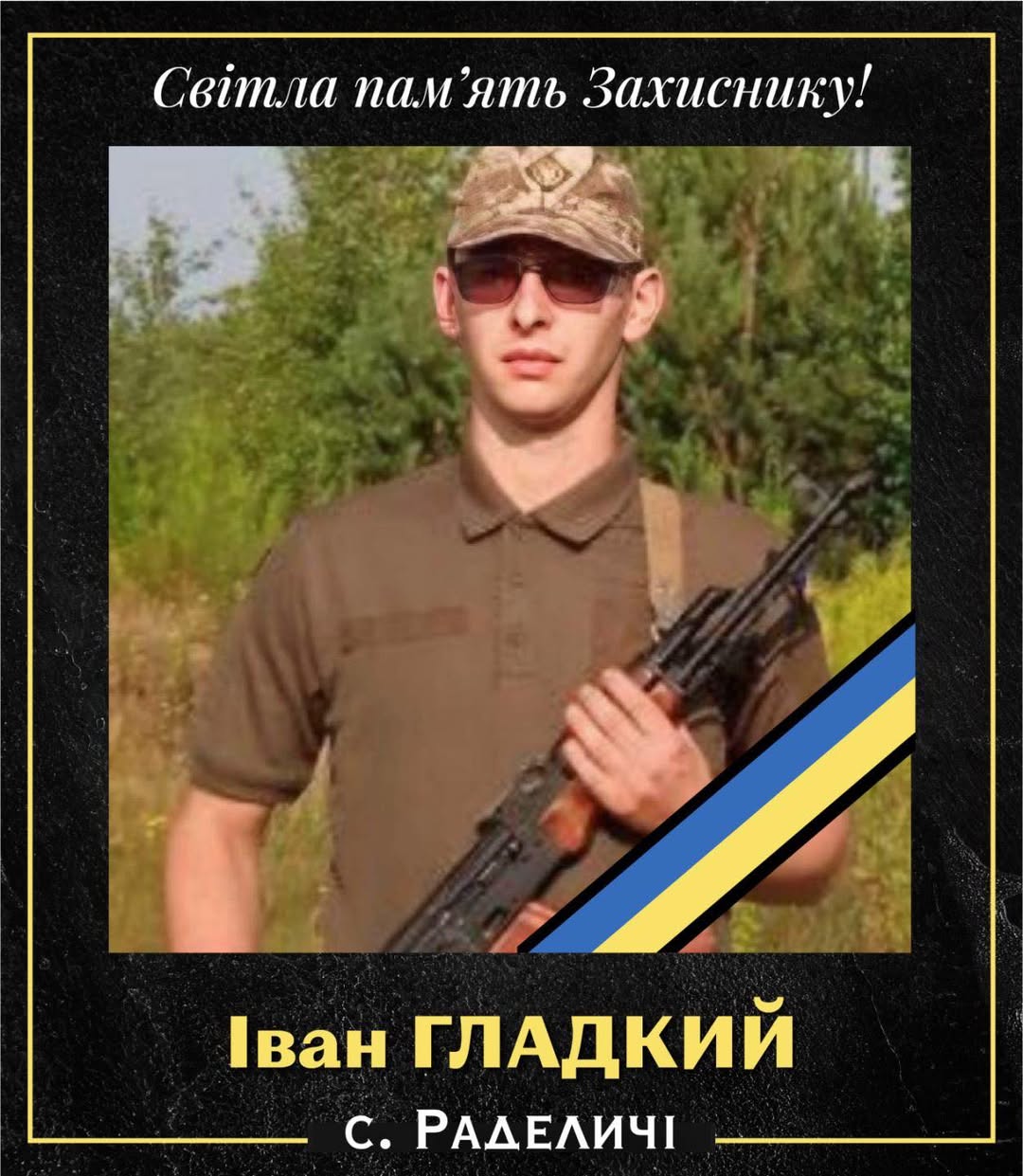 На війні з російським агресором загинув Захисник України, ГЛАДКИЙ Іван Петрович, 1998 року народження, родом із села Раделичі. Іван Петрович віддав своє життя за свободу та незалежність України.