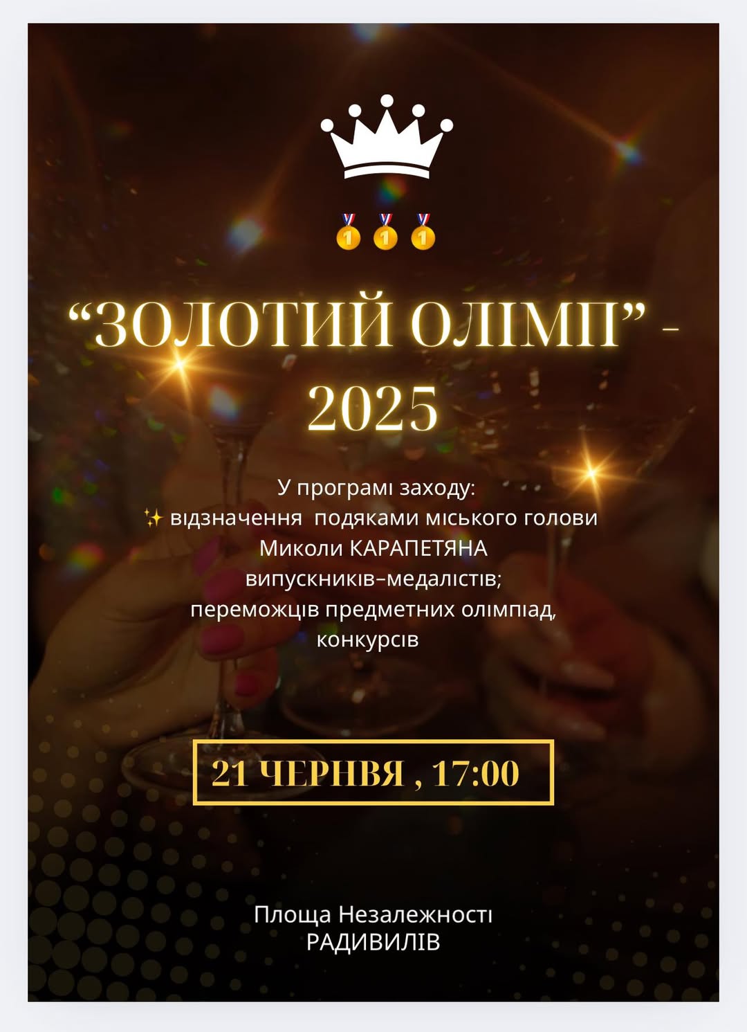 «ЗОЛОТИЙ ОЛІМП – 2025» – це чудова нагода підтримати молодь Радивилівської громади, яка прославляє наше місто своїми знаннями та наполегливістю. Ми пишаємося кожним учнем, який досягає високих результатів у навчанні та творчості. Їхні успіхи – це запорука процвітання нашої громади в майбутньому.