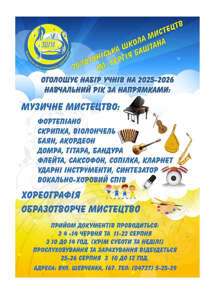 🎨🎶 Золотоніська школа мистецтв імені Сергія Баштана запрошує на навчання! 🎶🎨