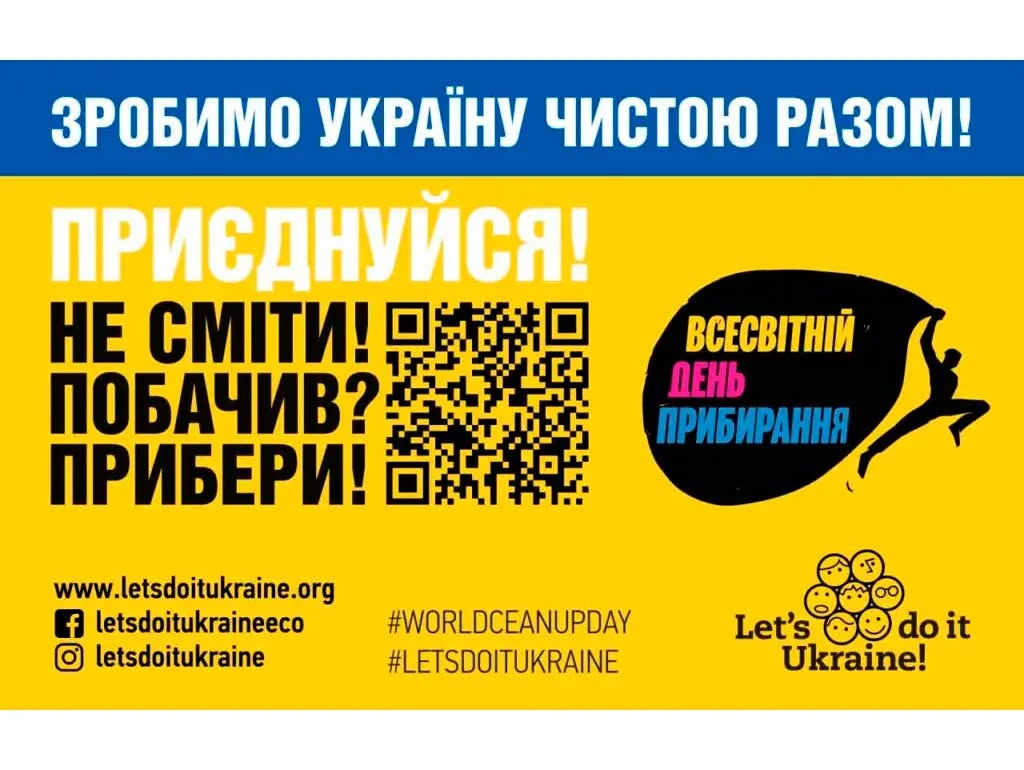 20 вересня 2025 року Україна вкотре традиційно приєднається до Всесвітнього дня прибирання «World Cleanup Day». Це наймасштабніша екологічна ініціатива у світі, яка щорічно об’єднує понад 114 мільйонів учасників зі 211 країн. Головна мета акції — формування культури чистоти, дбайливого ставлення до довкілля, відповідального споживання та правильного поводження з відходами. Всеукраїнський молодіжний рух «Let’s do it Ukraine» закликає всіх громадян України, як у країні, так і за її межами, долучитися до цієї важливої події. Ви можете взяти участь в одному з безпечних форматів у період з 20 серпня по 20 вересня. Обов’язково реєструйте результати своєї участі.