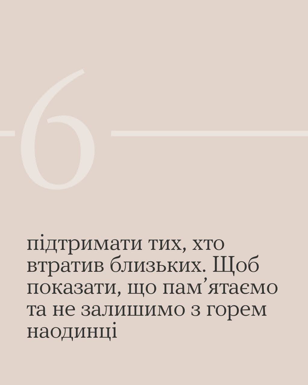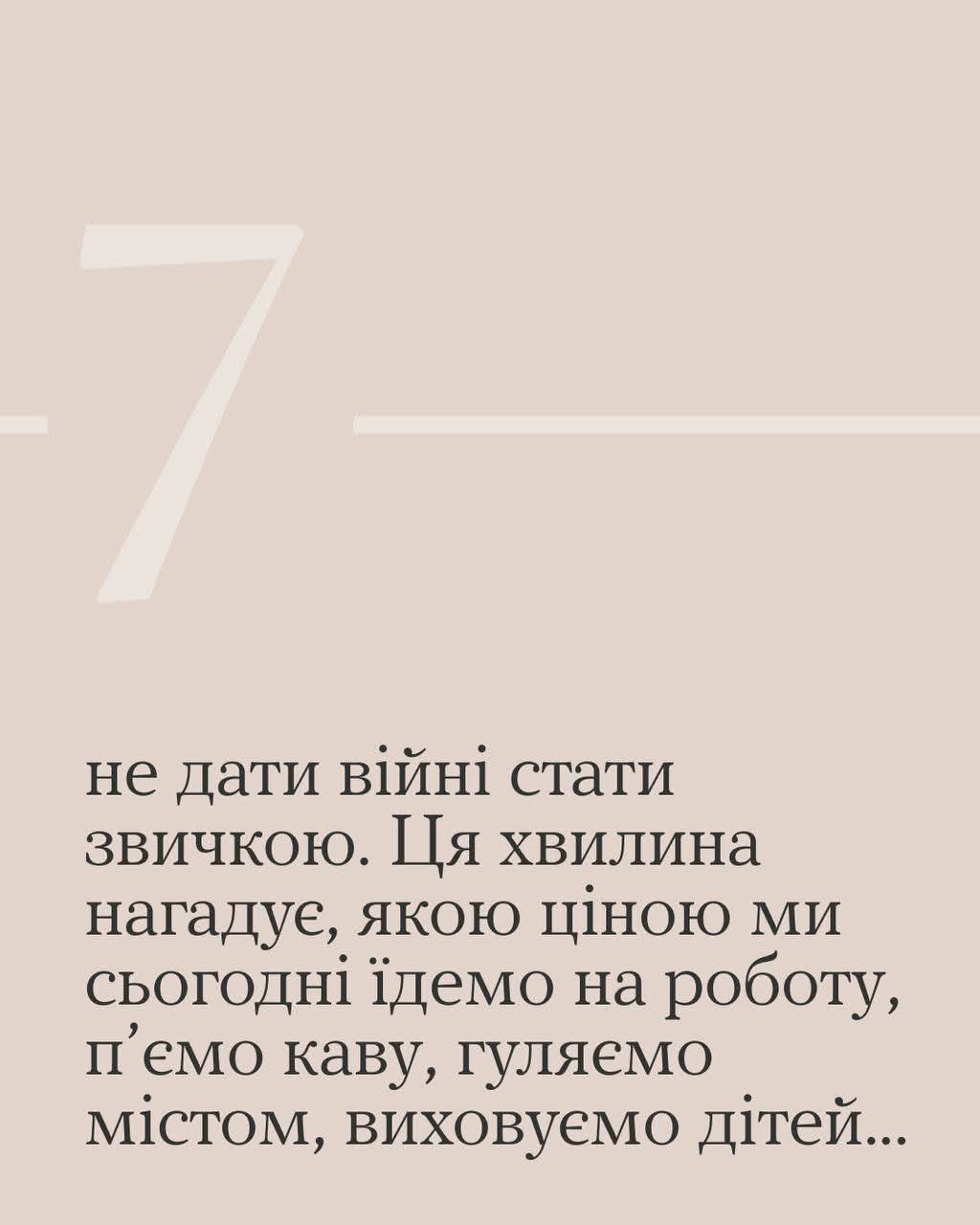 Зупинившись на одну хвилину, ми не запізнимося на роботу, транспорт не стане перевантаженим, а бізнес не зазнає жодних фінансових втрат. Навпаки, ця мить спокою та роздумів може надихнути нас на нові звершення та зміцнити нашу єдність.