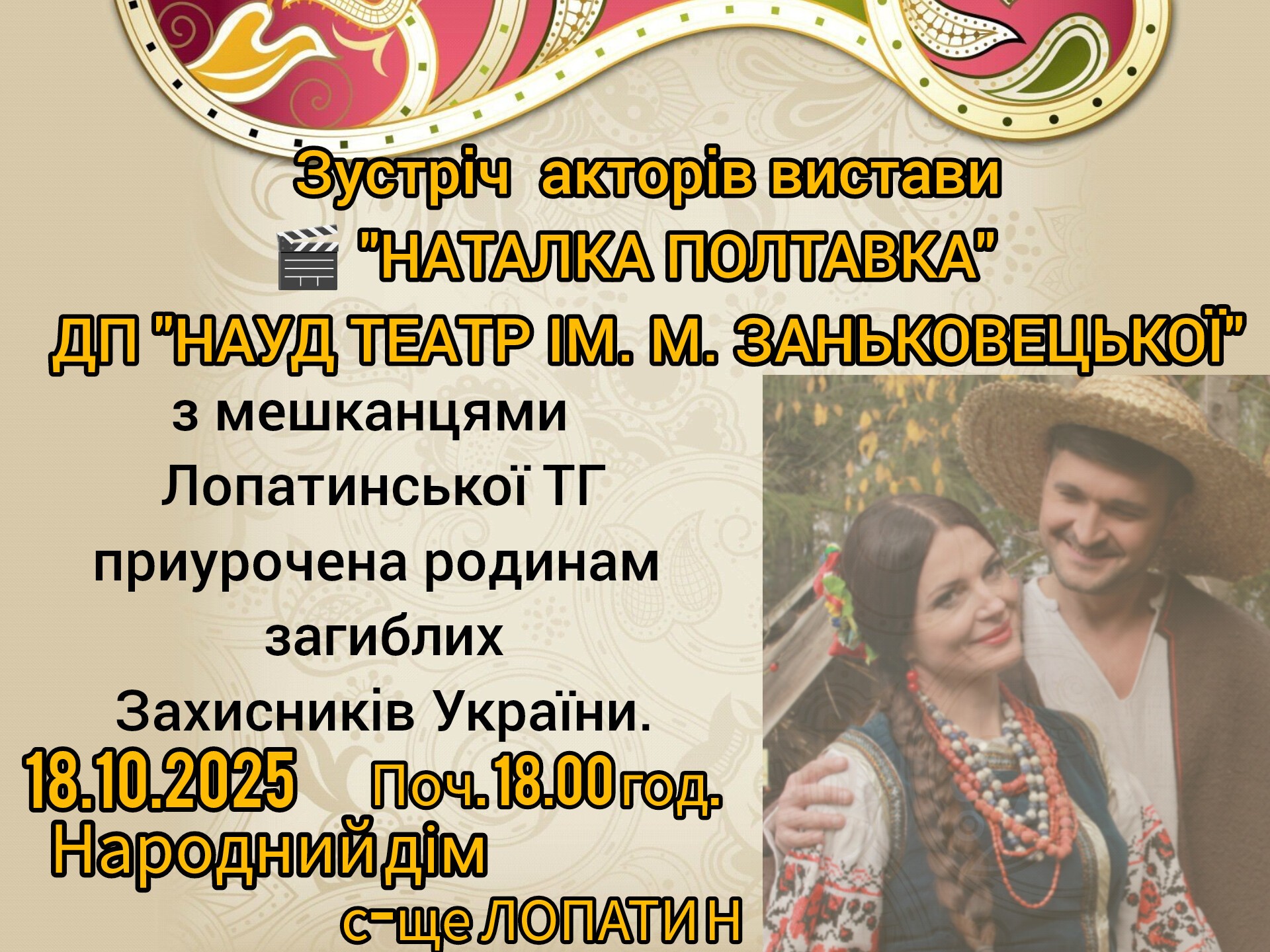🎬 Відбудеться особлива зустріч акторів Національного драматичного театру імені Марії Заньковецької з мешканцями Лопатинської територіальної громади. Ця подія присвячена родинам загиблих Захисників України і є виразом глибокої вдячності за їхню незламну мужність, невичерпну силу духу та безмежну любов до рідної землі. Зустріч акторів вистави “Наталка Полтавка” з громадою стане свідченням єднання мистецтва та пам’яті.