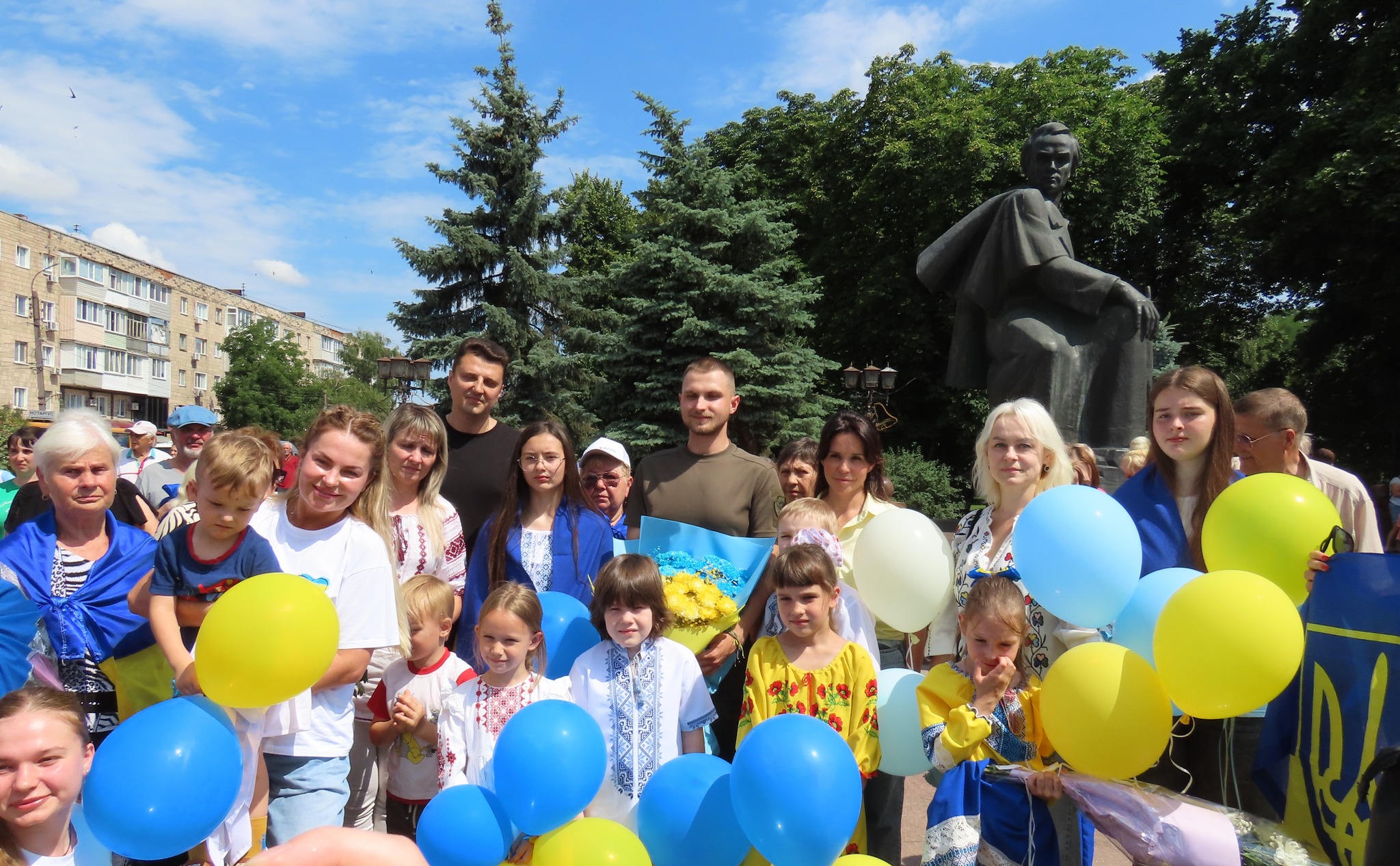 📍 На майданчику біля пам’ятника Тарасу Шевченку героя зустрічали рідні, друзі, мешканці громади, представники влади, діти та волонтери.