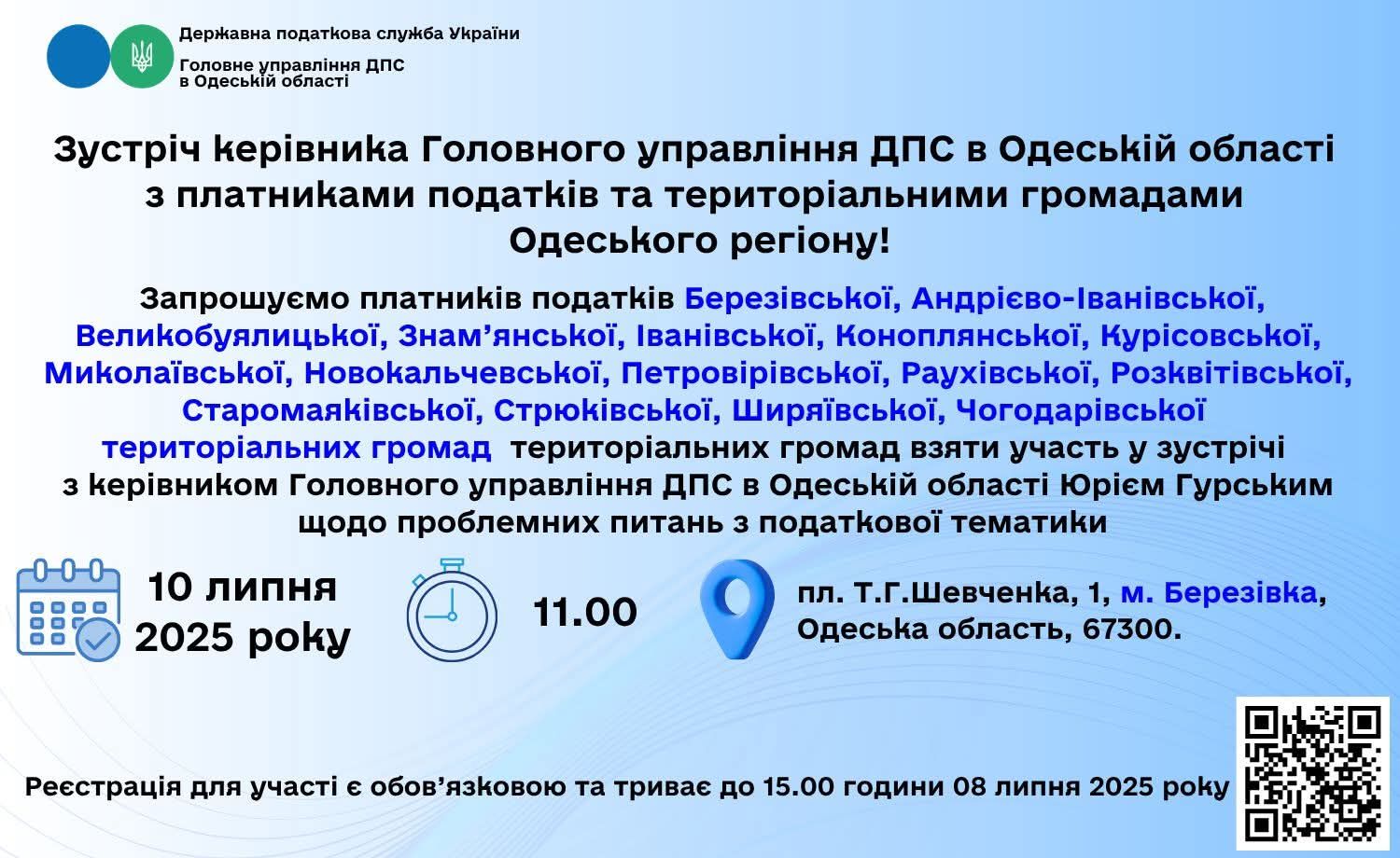 Головне управління ДПС в Одеській області запрошує платників податків Березівської, Андрієво-Іванівської, Великобуялицької, Знам’янської, Іванівської, Коноплянської, Курісовської, Миколаївської, Новокальчевської, Петровірівської, Раухівської, Розквітівської, Старомаяківської, Стрюківської, Ширяївської, Чогодарівської територіальних громад взяти участь у зустрічі з керівником Головного управління ДПС в Одеській області Юрієм Гурським щодо проблемних питань з податкової тематики.