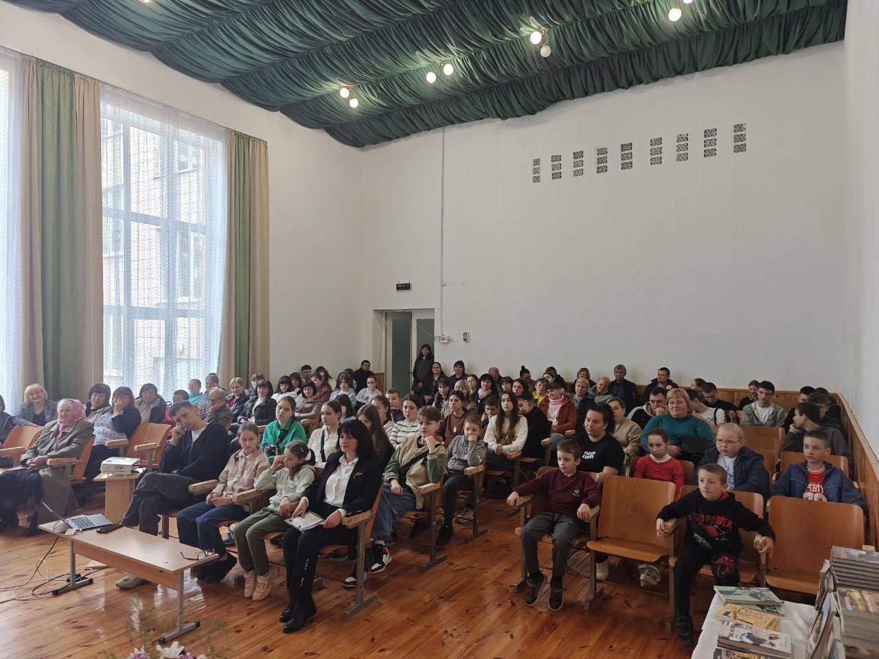 Зустріч з Євгеном Хотимчуком відбулася в актовій залі, де панувала атмосфера довіри та зацікавлення. Присутні мали змогу почути теплі спогади дитинства, розповіді про родину та творчі спроби. Письменник ділився думками про долі героїв своїх книг, що викликало особливі емоції. Євген Хотимчук у своїх творах говорить про вічні цінності українського народу, прагнучи просто та доступно розповідати про складне. Його творчість не залишає байдужим, бо написана рідною мовою, а теми, які він порушує, хвилюють кожного. Проза Євгена Хотимчука – це шлях до душі кожної людини, сповнений теплотою та любов’ю до історії України, природи, людини, мрії про волю та щастя.