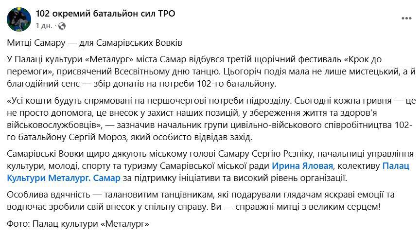 29 квітня в Палаці культури «Металург» пройшов третій щорічний фестиваль «Крок до перемоги», приурочений до Всесвітнього дня танцю. Захід об’єднав мистецьке й благодійне спрямування: під час фестивалю відбувався збір коштів на потреби 102-го батальйону.
