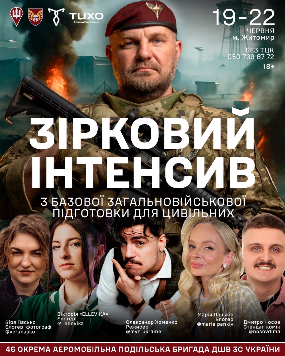 Не пропустіть унікальну можливість пройти зірковий інтенсив з базової загальновійськової підготовки для цивільних! Цей інтенсив, який пройде в мальовничому Житомирі, стане справжнім випробуванням і дозволить вам отримати базові навички, а також відчути, як це – бути поруч із тими, хто знає справжню ціну безпеки.