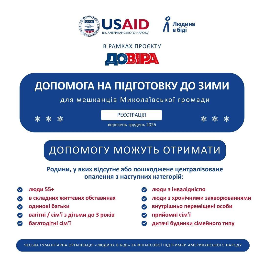 З вересня до грудня 2025 року в Миколаївській громаді триватиме важлива кампанія з реєстрації на отримання допомоги в рамках проєкту «ДОВІРА». Цей проєкт реалізується за підтримки авторитетної чеської гуманітарної організації «Людина в біді» та здійснюється завдяки фінансовій допомозі американського народу. Метою проєкту є підтримка найуразливіших верств населення, які найбільше потребують допомоги в складних умовах. Особлива увага приділятиметься домогосподарствам, які перебувають у найскладнішому становищі. Вони будуть ретельно відібрані для отримання одноразової фінансової допомоги, призначеної для підготовки до опалювального періоду. Ця допомога допоможе забезпечити тепло та комфорт у домівках під час холодів, що є критично важливим для багатьох родин. Реєстрація є важливим кроком для отримання необхідної підтримки. Миколаївська громада закликає всіх, хто відповідає критеріям вразливості, скористатися цією можливістю. Проєкт «ДОВІРА» є прикладом ефективної міжнародної співпраці, спрямованої на покращення життя людей. Чеська організація «Людина в біді» має багаторічний досвід роботи в гуманітарній сфері, а фінансова підтримка від американського народу підкреслює глобальну солідарність у допомозі тим, хто її потребує. Опалювальний період може стати справжнім випробуванням для багатьох домогосподарств, тому своєчасна допомога є надзвичайно цінною. Ця ініціатива покликана полегшити фінансовий тягар та забезпечити базові потреби. Детальнішу інформацію про умови участі та процес реєстрації можна знайти за посиланням: https://mykolaivska-gromada.gov.ua/news/1758267329/. Не пропустіть можливість отримати допомогу!