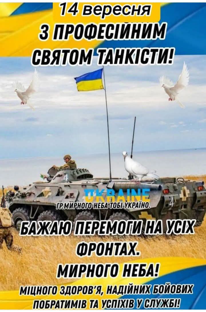 З Днем танкових військ України! Вітаємо мужніх та відважних воїнів, які самовіддано захищають нашу державу. Ваша служба – це щоденний подвиг, що вимагає неабиякої сили духу, витримки та високого професіоналізму. Танкові війська України – це сталева міць, яка наводить жах на ворога та вселяє впевненість у кожного українця. Ми глибоко шануємо ваш внесок у захист незалежності та територіальної цілісності нашої Батьківщини.