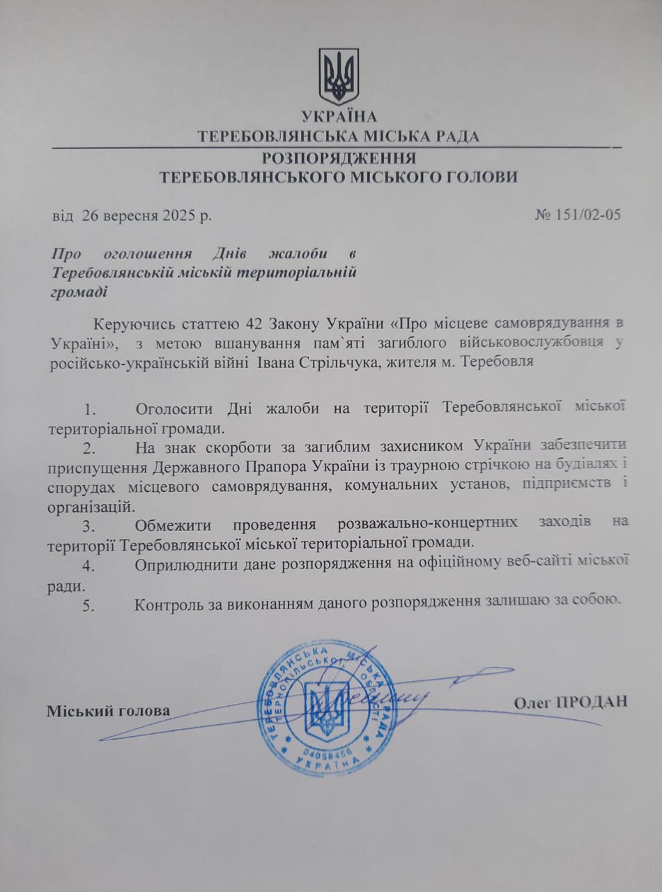 🕯 У зв’язку з трагічною загибеллю Героя, мешканця міста Теребовля Івана Стрільчука, який віддав своє життя у російсько-українській війні, на території Теребовлянської міської територіальної громади офіційно оголошено Дні жалоби. Це рішення, спрямоване на вшанування пам’яті загиблого захисника, було закріплене розпорядженням Теребовлянського міського голови Олега Продана.