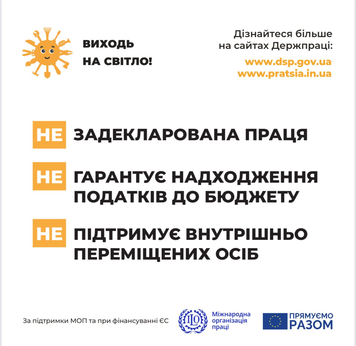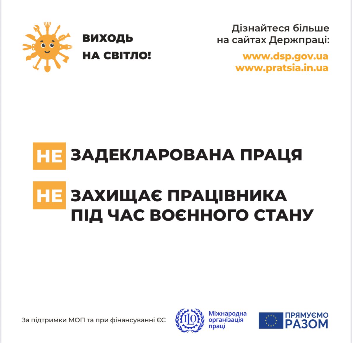 Закликаємо всіх роботодавців та працівників приєднатися до кампанії «Виходь на світло!». Легалізація трудових відносин – це крок до прозорого, справедливого та безпечного робочого середовища для кожного українця. Це інвестиція у власне майбутнє та стабільність держави. Пам’ятайте, що офіційно оформлений працівник – це захищений працівник, а відповідальний роботодавець – це приклад для наслідування.