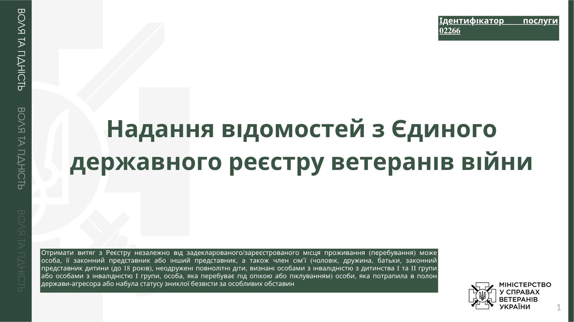 Ця послуга передбачає можливість отримання офіційних витягів із реєстру для підтвердження статусу ветерана війни, учасника бойових дій, особи з інвалідністю внаслідок війни тощо.