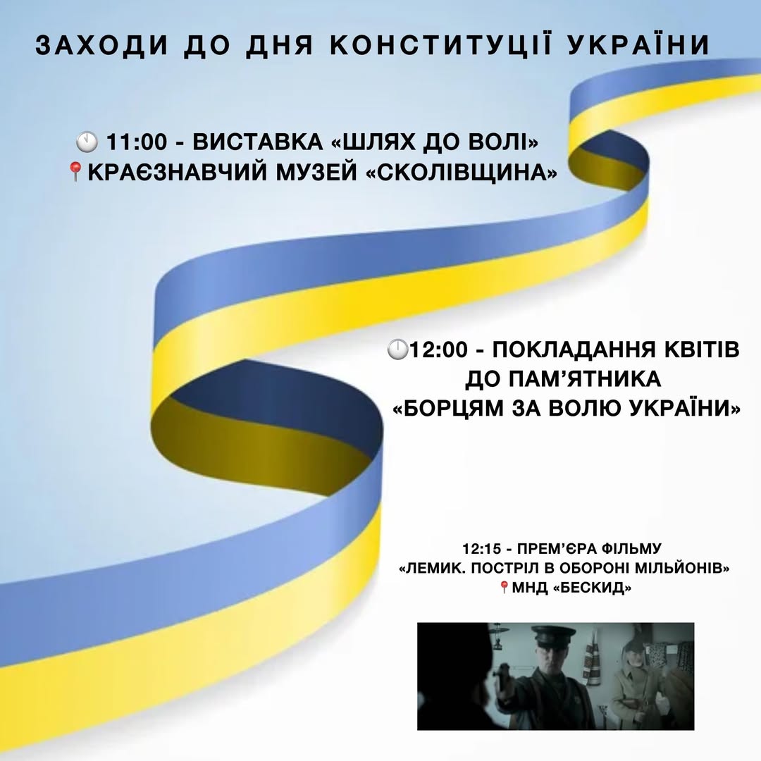 З нагоди відзначення 29-ї річниці з дня ухвалення Верховою Радою Основного Державного Закону – Конституції України, 27 червня відбудуться такі заходи: