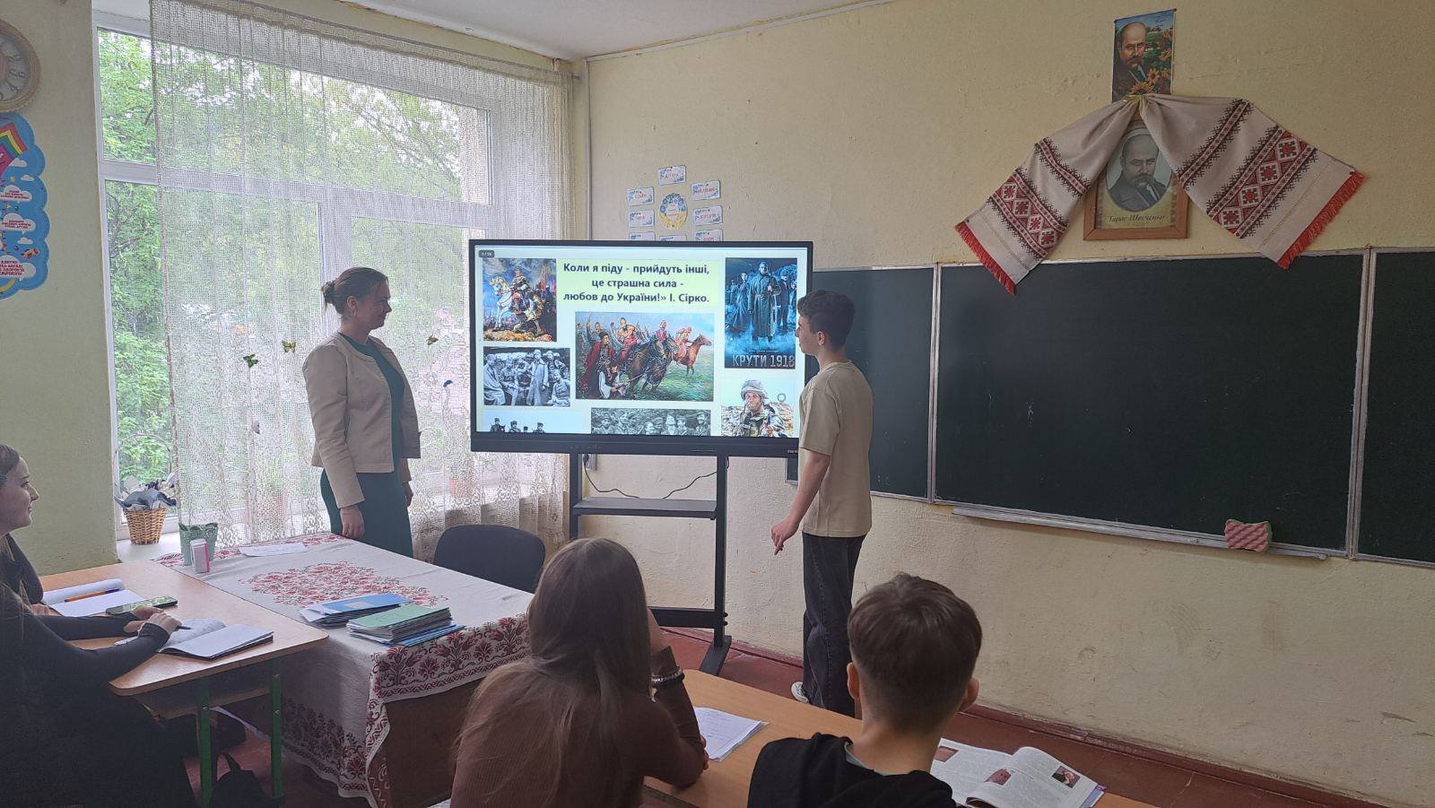 У День Героїв, вчителька історії Комар А.Ю. провела тематичне заняття з учнями 8-Б класу. Тема заняття: «Вони стояли на смерть заради перемоги». Метою заходу було вшанування пам’яті всіх борців за незалежність України, починаючи від княжих часів і закінчуючи сучасними героями.