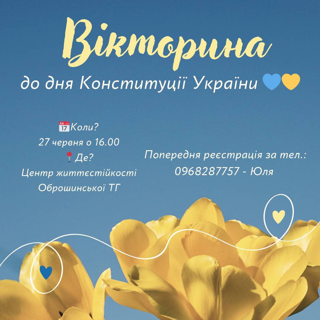 🔹27 червня о 16.00 годині у Центрі життєстійкості Оброшинської ТГ відбудеться вікторина. На учасників чекають цікаві запитання, подарунки та гарний настрій. Попередня реєстрація обов’язкова за телефоном: 096 828 77 57 (Юля).