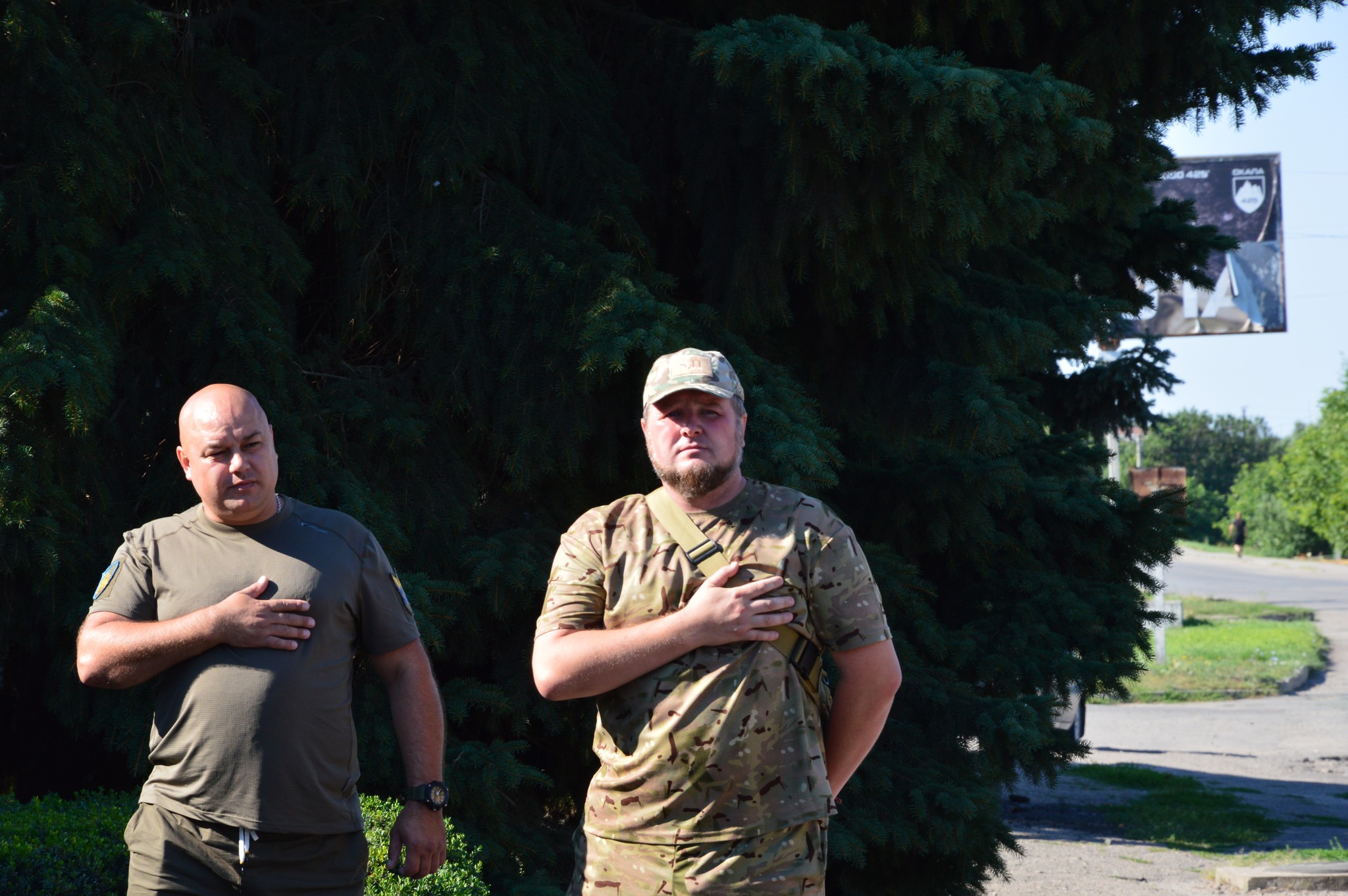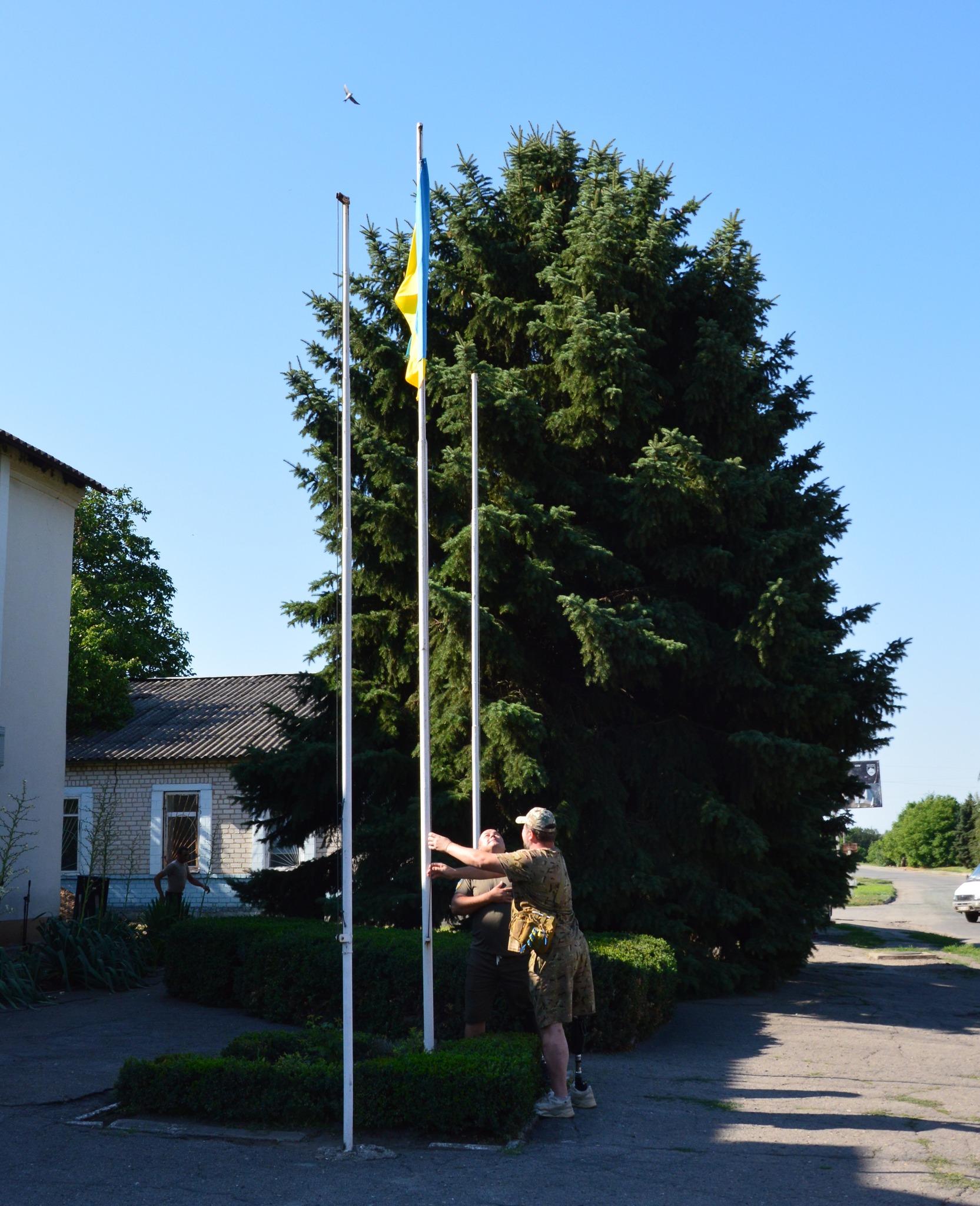 🔷Право підняти Державний Прапор було надано ветеранам війни, учасникам бойових дій — Віталію Горюнову та Івану Обрядіну. Під звуки Державного Гімну України синьо-жовтий стяг урочисто здійнявся над центральною площею селища.