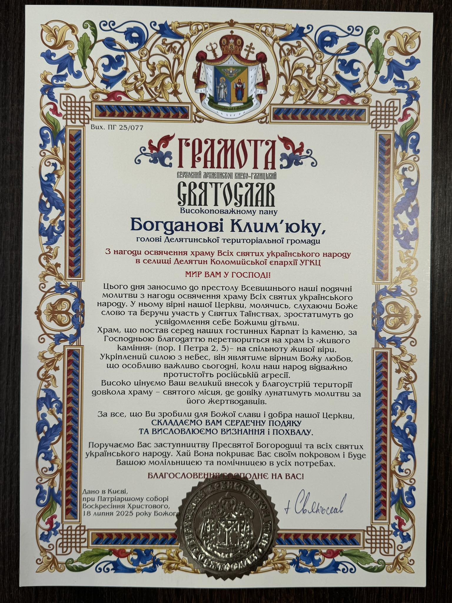 З нагоди знаменноъ події – освячення величного храму Всіх Святих українського народу в мальовничому селищі Делятин, було вiдзначено особливу честь. Глава УГКЦ, Блаженніший Патріарх Святослав Шевчук, особисто вручив почесну грамоту. Ця висока відзнака є свідченням визнання спільних зусиль усієї громади, кожного, хто доклав своєї праці, докладав зусиль до будівництва, підготовки та урочистого освячення цього духовного центру. Щира подяка лунає на адресу Господа Бога за Його благословення. Глибока вдячність Збройним Силам України за захист та можливість творити добро. Слова подяки звернені до всіх, і особливо до кожної людини, яка своїми руками та серцем долучилася до спільної праці, що принесла користь Церкві, громаді та незалежній Україні. Слава Ісусу Христу! Слава Україні!