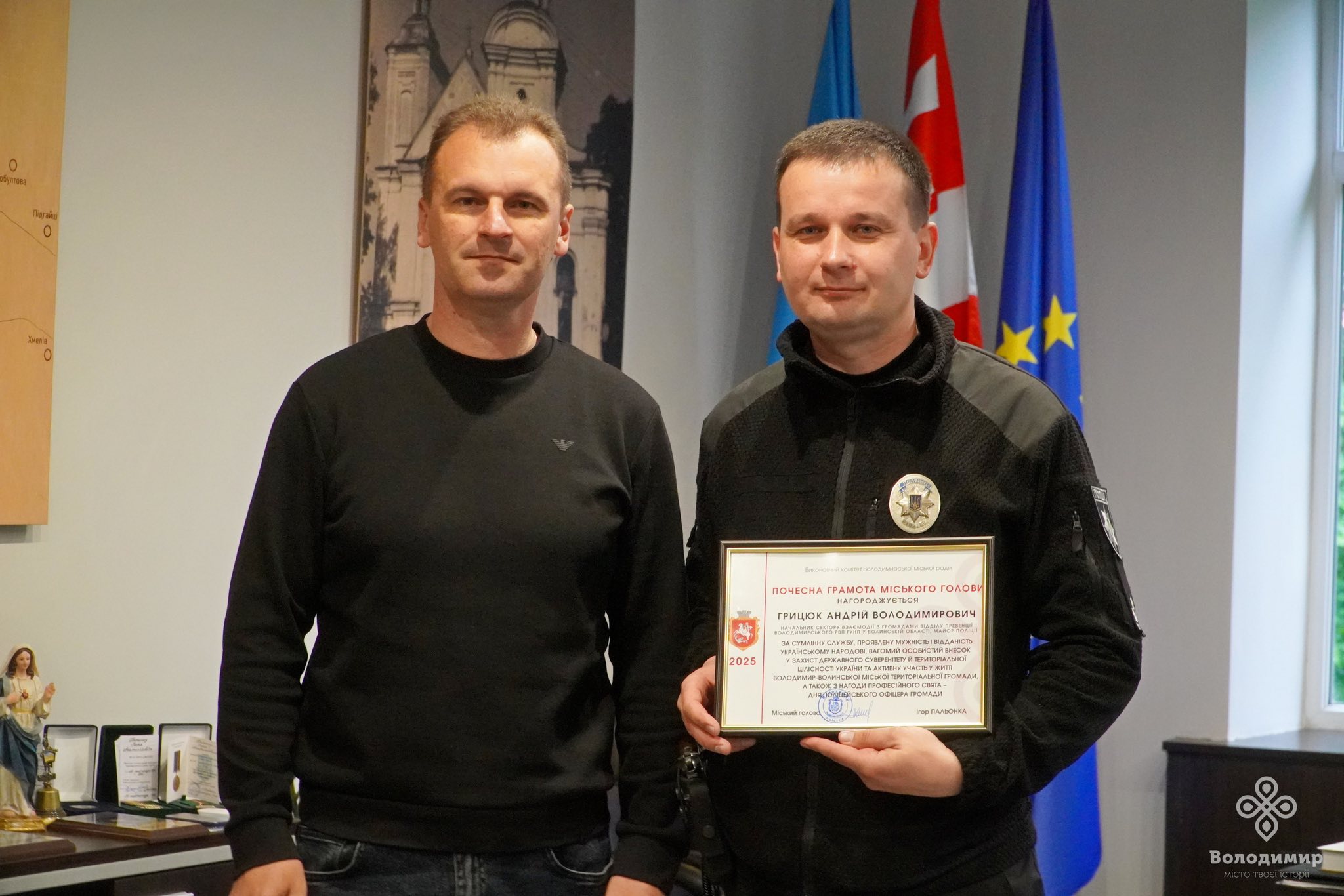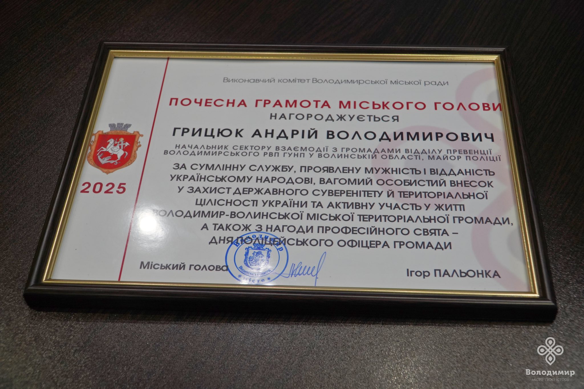 Поліцейський офіцер громади – це запорука безпеки та спокою. З нагоди професійного свята привітано поліцейського офіцера Володимирської громади, Андрія Грицюка. Він є одним з перших поліцейських офіцерів громади (ПОГ). Спочатку Андрій Грицюк був офіцером Зарічанської громади, а згодом, коли розпочалися процеси децентралізації, перейшов до Володимирської громади. Його професіоналізм та відданість обов’язку неодноразово підтверджували, що служити та захищати – це не просто робота, а справжнє покликання. Андрій Грицюк – приклад відданого служіння.