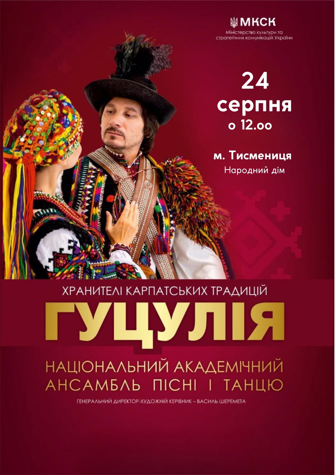 🇺🇦 З нагоди 34-ї річниці Незалежності України та Дня міста Тисмениця, 24 серпня, о 12:00 год. запрошуємо вас на унікальний концерт Національного академічного ансамблю пісні і танцю “Гуцулія”. Це особлива подія, яка поєднує святкування державної незалежності та місцевих урочистостей. Захід відбудеться у Народному домі міста Тисмениця. Вхід на цей чудовий захід є абсолютно безкоштовним. Ми запрошуємо всіх приєднатися до цієї зустрічі, сповненої пісні, танцю та музики, що випромінюють душу та красу Карпатського краю. Відчуйте справжній дух України через яскраві виступи талановитих артистів. Цей концерт – це не лише розвага, але й можливість доторкнутися до культурної спадщини та відчути єднання громади.