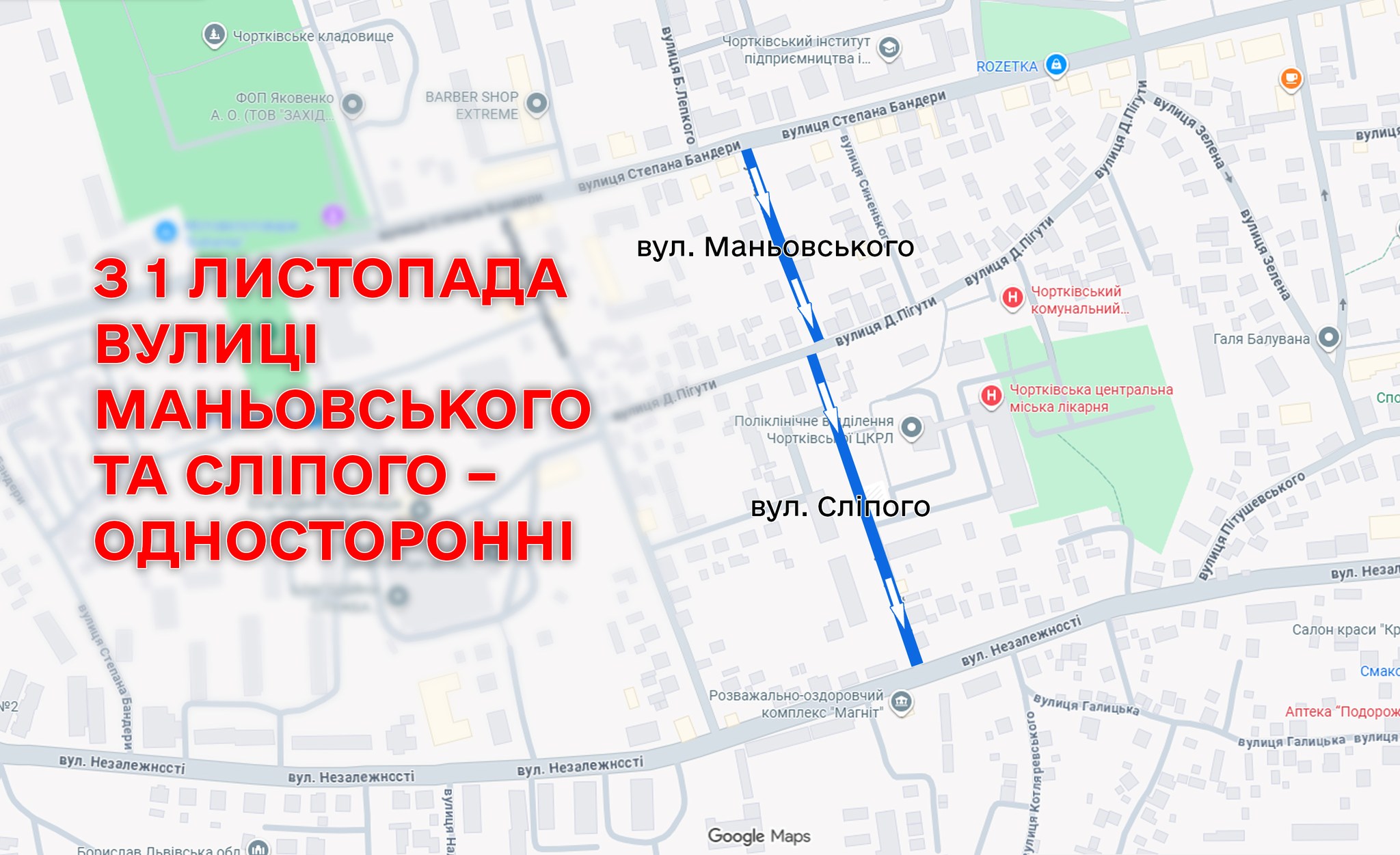 З 1 листопада у Чорткові відбудуться значні зміни у схемі організації дорожнього руху на вулицях Маньковського та Сліпого. Ці вулиці стануть односторонніми, що покликане впорядкувати транспортний потік та покращити безпеку для всіх учасників дорожнього руху.