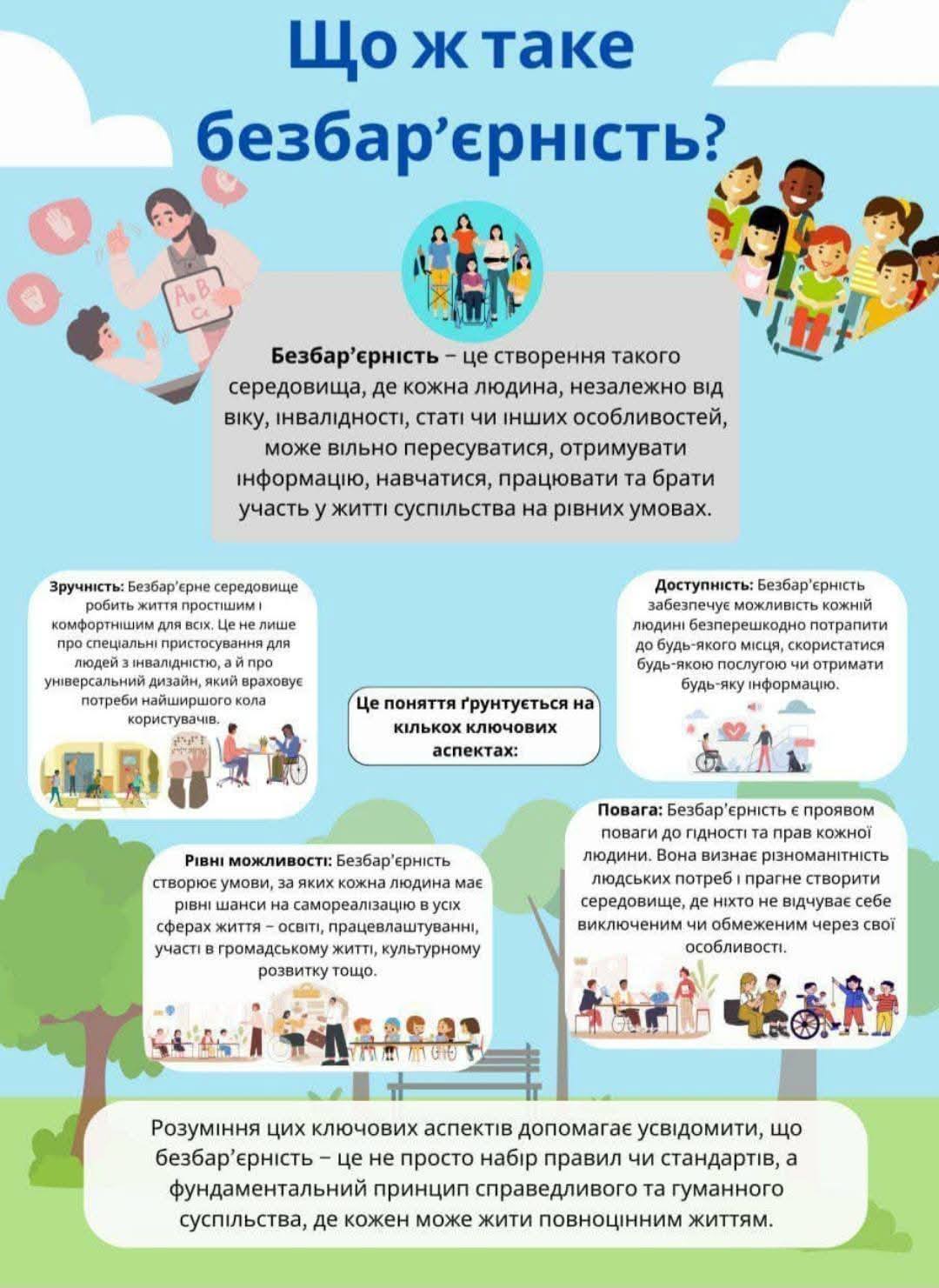 📌З 19 по 25 травня в Україні відзначається Національний тиждень Безбар’єрності – важлива ініціатива, націлена на привернення уваги до створення доступного та інклюзивного суспільства для кожного громадянина! Цей тиждень безбар’єрності має на меті підвищити обізнаність суспільства щодо важливості безбар’єрності та її впливу на розвиток нашої країни, а також заохотити людей долучатися до вже існуючих проєктів та ініціатив. Найголовніше завдання – сформувати позитивне ставлення до безбар’єрності як до невід’ємної частини суспільних норм. Адже безбар’єрність – це, перш за все, зручність для кожного з нас, це можливість діяти без перешкод. В умовах воєнного стану та майбутньої відбудови України питання безбар’єрності стає особливо актуальним. Збільшення кількості людей з інвалідністю робить забезпечення доступу до базових потреб і прав ще більш важливим завданням.