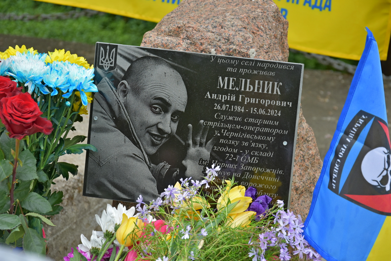 Право відкрити меморіальну дошку було надано сестрі Героя, Наталії Бровко. Вона висловила щиру подяку всім, хто підтримує родину в цей важкий час, хто пам’ятає та шанує подвиг її брата. 🙏🕯️Андрій Мельник назавжди залишиться в нашій пам’яті прикладом мужності, патріотизму та самопожертви.