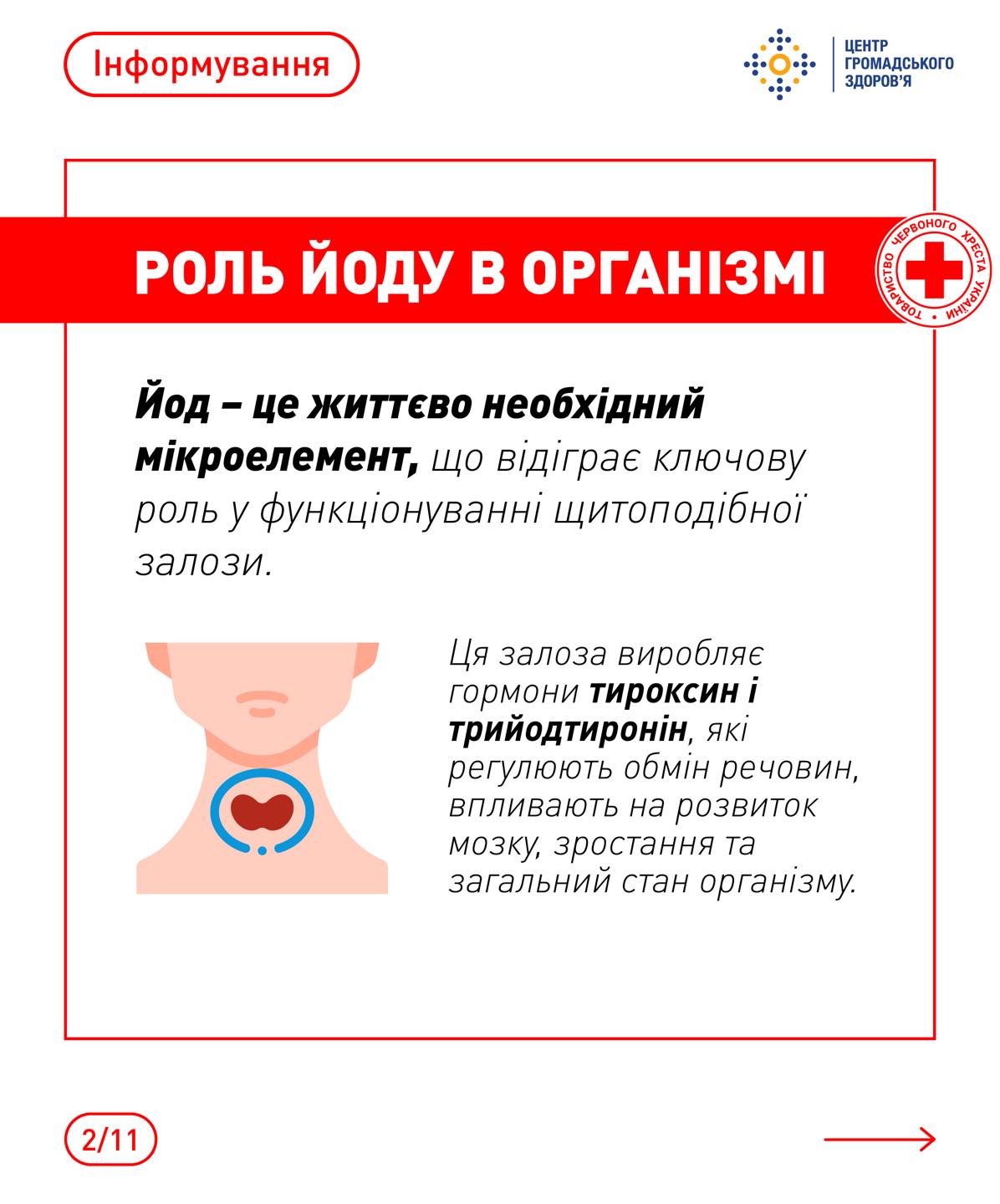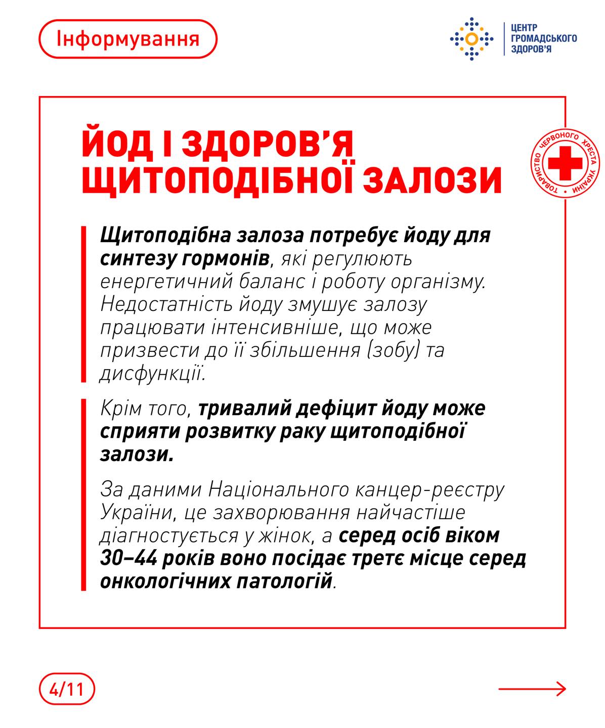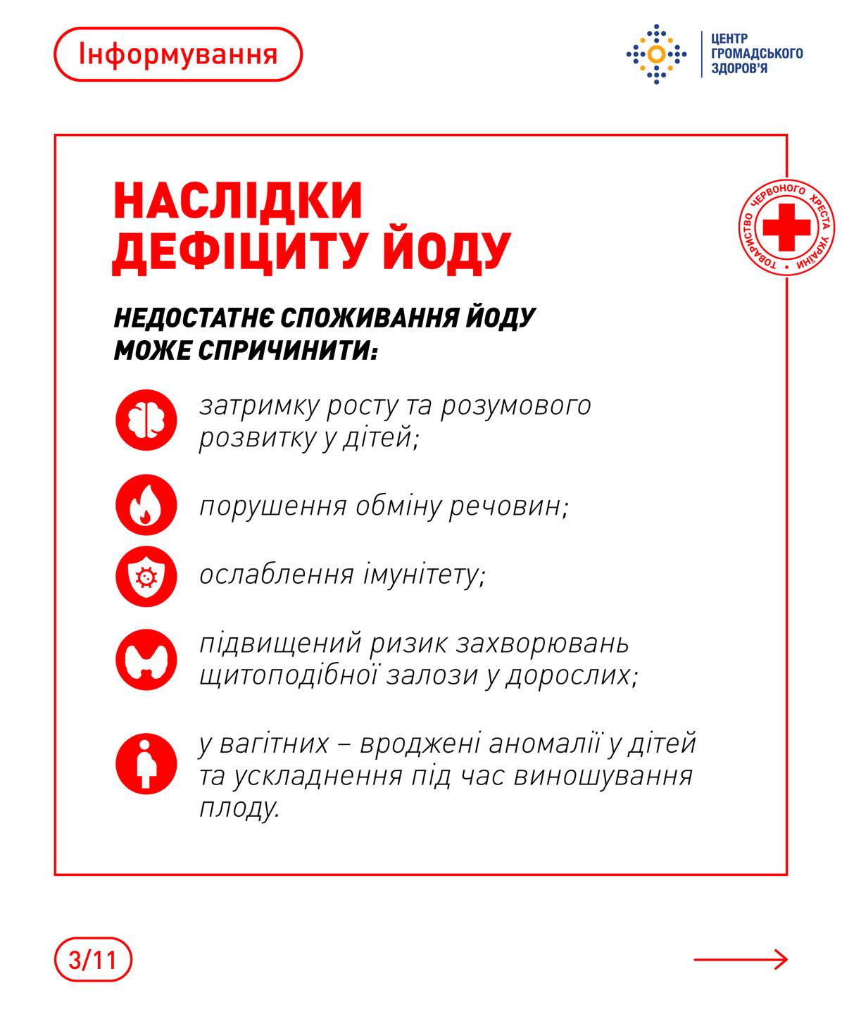Червоний Хрест України наголошує на важливості постійної турботи про власне здоров’я та профілактики йододефіциту. Важливо розуміти, які продукти є багатими на йод, та включати їх до свого раціону. До таких продуктів належать морська риба, морепродукти, морська капуста, а також йодована сіль. Застосування йодованої солі в повсякденному приготуванні їжі є одним із найпростіших та найефективніших способів запобігти нестачі йоду. Важливо також пам’ятати, що термічна обробка може зменшувати вміст йоду в продуктах, тому корисно споживати деякі з них у сирому вигляді або з мінімальною термічною обробкою.