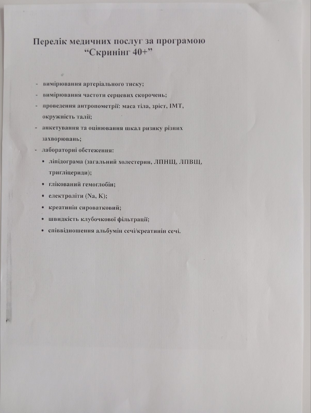 Дізнатися більше про умови участі та деталі програми ви можете за посиланням: https://screening.moz.gov.ua. Не відкладайте турботу про своє здоров’я на потім! Своєчасне проходження обстежень є запорукою довгого та якісного життя. Скористайтеся можливістю, яку надає держава, для профілактики та збереження вашого добробуту. Пам’ятайте, що профілактика захворювань є набагато ефективнішою та менш витратною, ніж лікування вже наявних недуг. Ваше здоров’я — у ваших руках, і програма «Скринінг здоров’я 40+» є чудовим інструментом для його збереження. Скористайтеся цією можливістю, щоб переконатися у відсутності прихованих загроз для вашого організму.