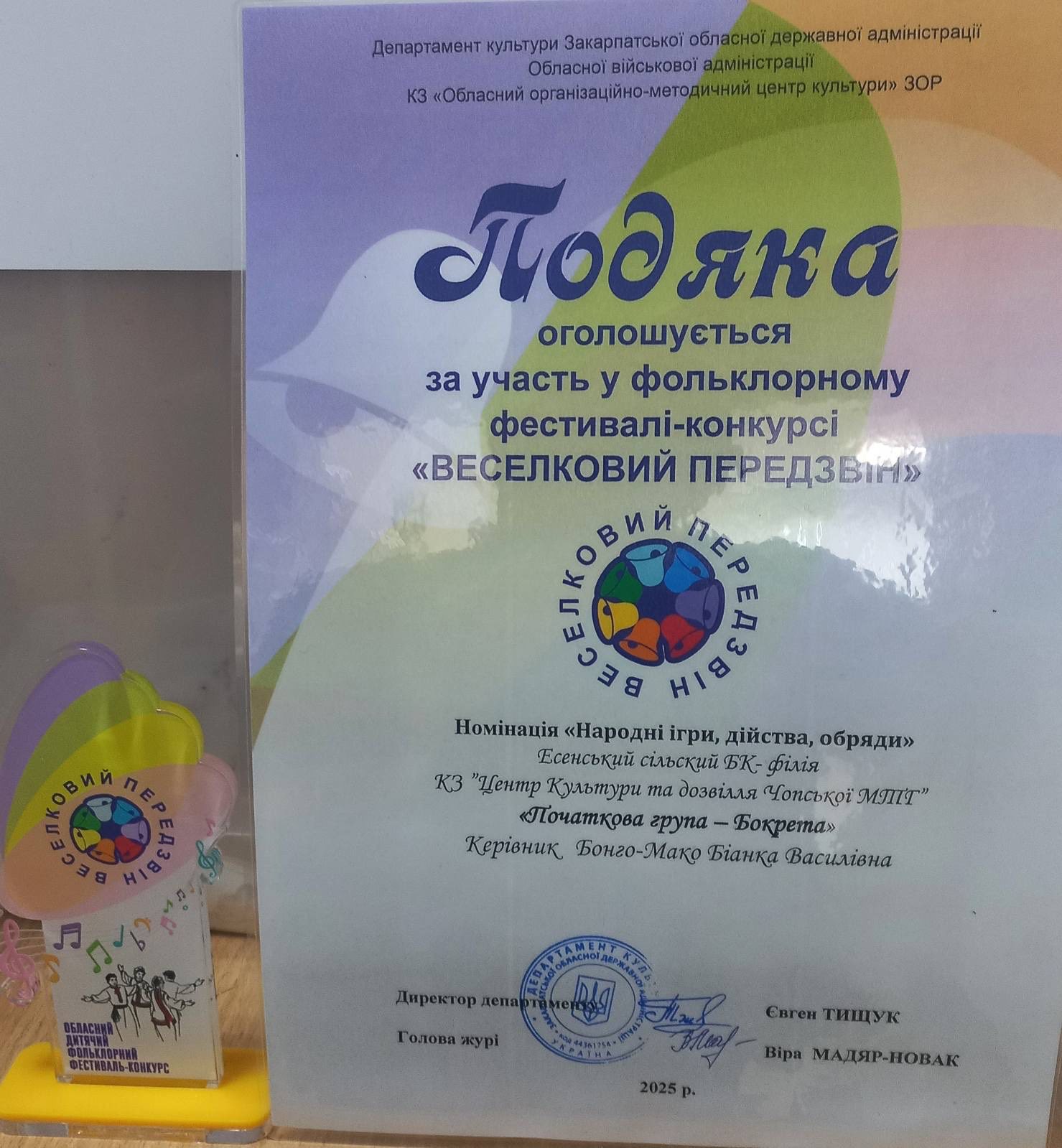КЗ “ЦКД Чопської МТГ” щиро вітає талановитих керівників і творчі колективи: “Ритм” (керівник Сабов Т.), “Бокрета” (молодша група колективу “Кристал”, керівник Бонго-Мако Б., Есенський СБК-філія), “Наргіс” (керівник Єрмоленко О.), “Арабеск” (керівники Ковач Т. та Волос О.) та “Переможець” (керівник Паленков Р.) з блискучою участю та заслуженим отриманням нагород за призові місця у престижних Всеукраїнських конкурсах і фестивалях! Ми пишаємося вашими досягненнями!