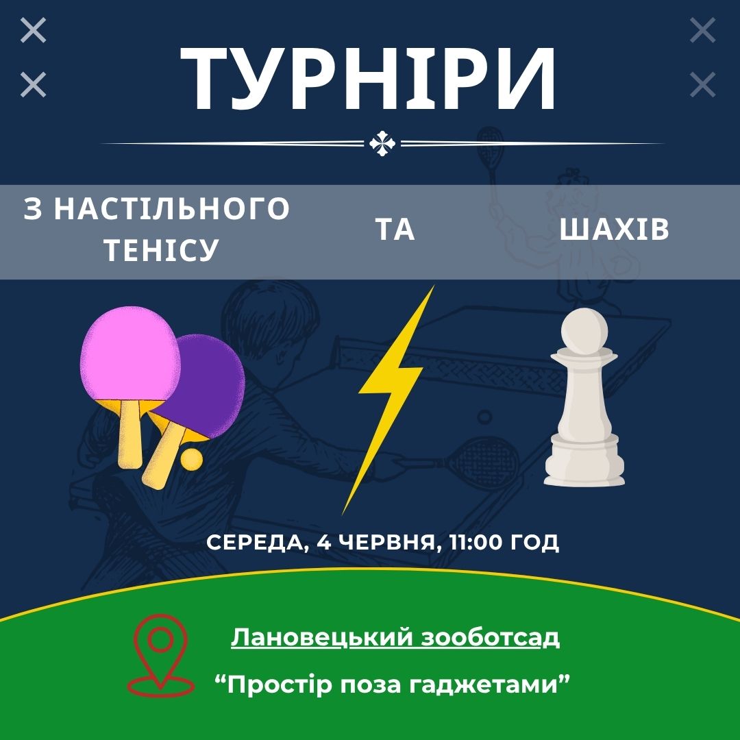Турніри з шахів та настільного тенісу відбудуться 4 червня об 11:00 на локації «Простір поза ґаджетами» в Лановецькому зооботсаду. Це чудова можливість відчути смак перемоги, отримати заряд адреналіну та насолодитися живим спілкуванням без екранів телефонів.