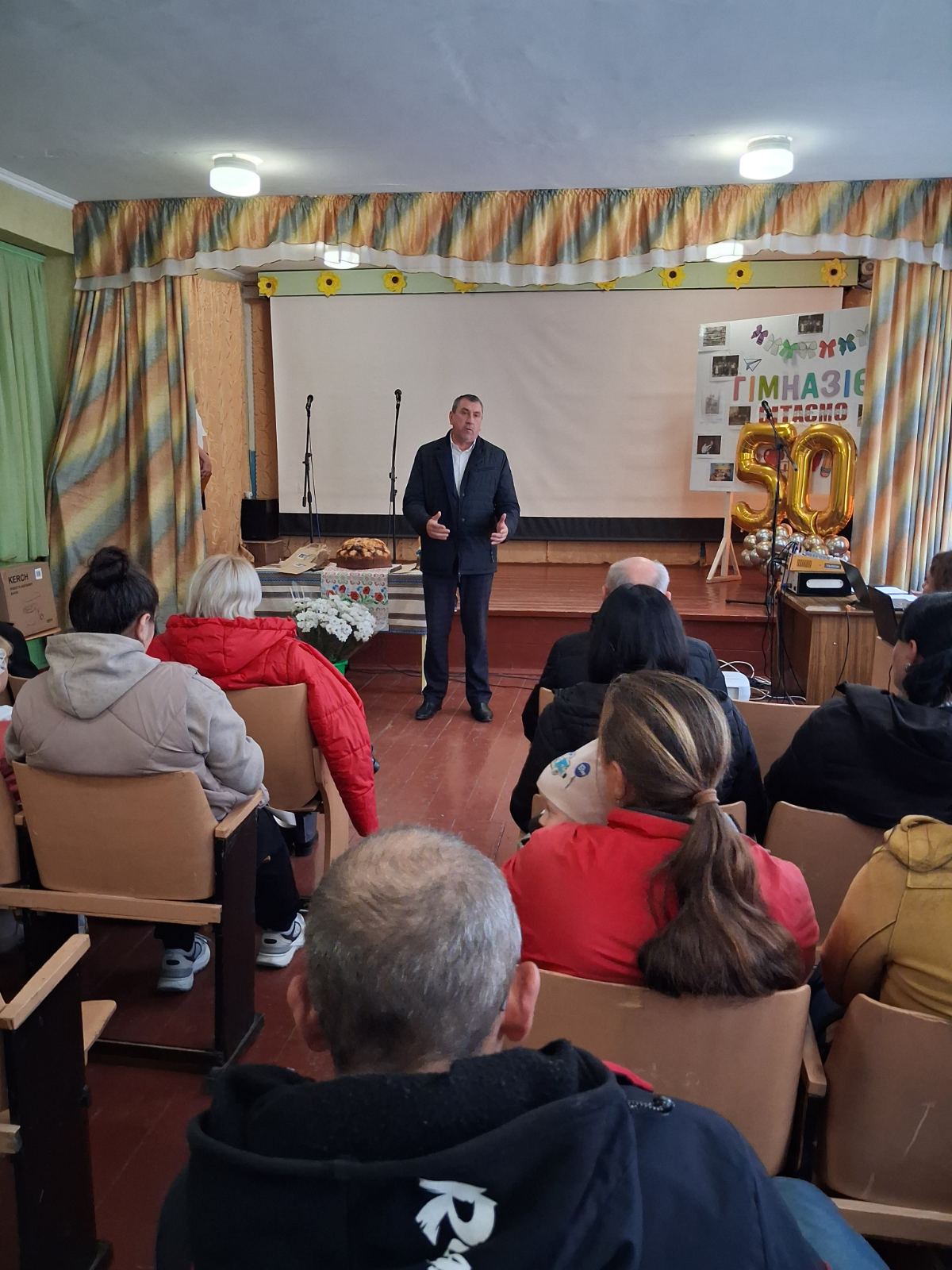 Серед поважних гостей свята був присутній заступник міського голови з питань діяльності виконавчих органів ради Юрій Свідерський. Він сердечно привітав багаторічний колектив гімназії з вагомим ювілеєм, висловивши глибоку вдячність за їхню віддану працю, неоціненний освітній внесок у розвиток громади та за виховання нових поколінь українців. Його слова підкреслили важливість гімназії як осередку знань та патріотизму.