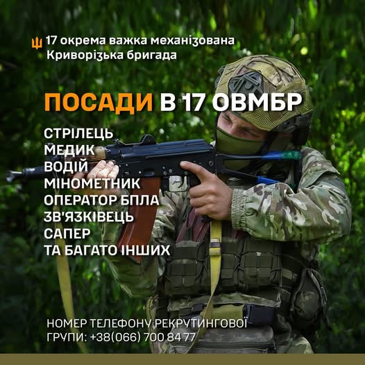 Не чекайте на зміни – станьте їх творцем! Оберіть свій шлях захисника України вже сьогодні! 💪 Приєднуйтесь до 17-ї бригади та служитимете разом з нами до перемоги. Ваша участь важлива! #БезТебеНеЗакінчиться #ТвояУчастьВажлива #РазомДоПеремоги