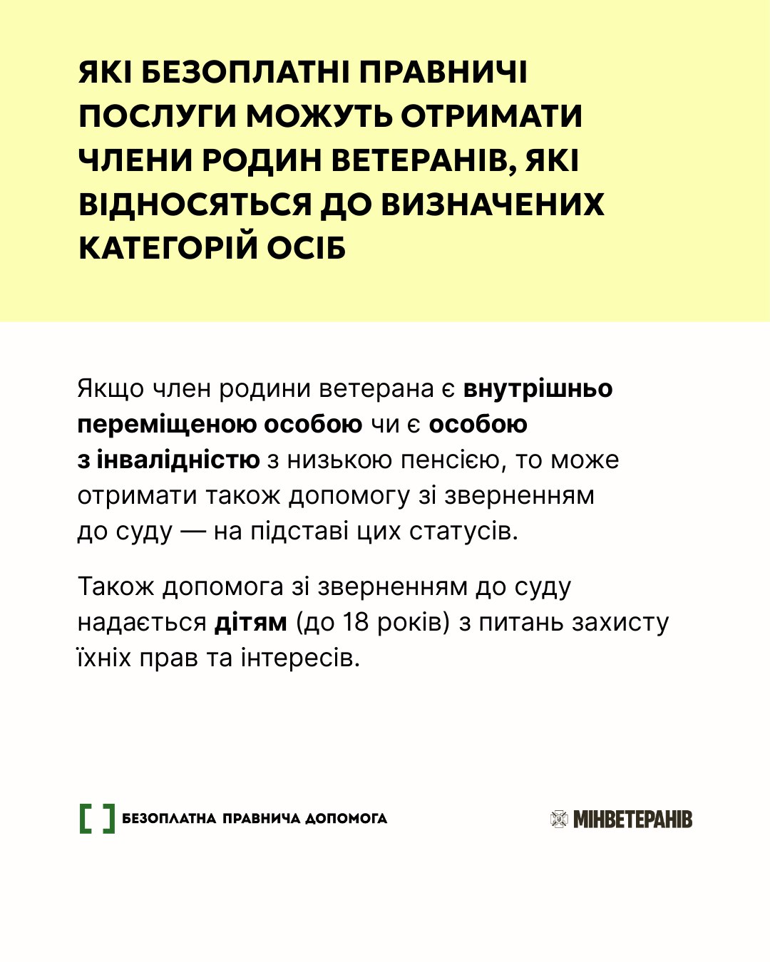 Повноцінна інтеграція та захист прав ветеранів, ветеранок, їхніх сімей, а також родин полеглих Захисників і Захисниць є одним із пріоритетних напрямків державної політики в Україні. У цьому контексті ключову роль відіграє системна безоплатна правова допомога, яка гарантується державою та надається всім, хто цього потребує. Кожен, хто віддав свій обов’язок Батьківщині, та їхні близькі мають повне право на кваліфіковану юридичну підтримку без жодних фінансових витрат. Ця ініціатива спрямована на забезпечення соціальної справедливості та всебічного захисту інтересів цієї важливої категорії громадян, сприяючи їхній адаптації та вирішенню нагальних проблем.Для забезпечення максимально широкого доступу до правничої допомоги створено розгалужену мережу точок, де можна отримати необхідні консультації та представництво інтересів. Скористатися послугами можна у будь-якій найближчій державній точці доступу до безоплатної правової допомоги ветеранам. Ці центри ефективно функціонують по всій території України, охоплюючи як великі міста, так і віддалені населені пункти, щоб жоден ветеран чи його родина не залишилися без необхідної підтримки. Фахівці центрів готові надати вичерпні відповіді на широкий спектр питань, від оформлення документів до захисту в суді.Окрім особистого візиту, існують зручні дистанційні канали зв’язку для отримання безоплатної правової допомоги. Ви можете звернутися за юридичною підтримкою, зателефонувавши на гарячу лінію за номером 0 800 213 103. Цей номер є безкоштовним для дзвінків з мобільних та стаціонарних телефонів по всій Україні, забезпечуючи оперативну консультацію від кваліфікованих юристів. Крім того, для швидкого вирішення питань або отримання попередньої консультації, доступний Telegram-бот @LegalAidUkraineBot. Достатньо залишити своє звернення у чаті, і юрист зв’яжеться з вами протягом 15 хвилин, надавши відповіді на найактуальніші запитання. Ці цифрові інструменти значно спрощують доступ до правової допомоги, роблячи її доступною 24/7.Важливо зазначити, що консультації та юридична підтримка надаються не лише у спеціалізованих центрах. Для зручності та доступності, фахівці з безоплатної правової допомоги регулярно проводять виїзні консультації безпосередньо у військових частинах, територіальних центрах комплектування та соціальної підтримки (ТЦК та СП), військових госпіталях, Центрах надання адміністративних послуг (ЦНАПах), спеціалізованих ветеранських просторах та у приміщеннях громадських організацій. Такий підхід дозволяє максимально наблизити юридичні послуги до тих, хто їх найбільше потребує, враховуючи специфіку потреб військовослужбовців та ветеранів у різних регіонах країни. Кожен Захисник та їхні рідні заслуговують на швидке та ефективне вирішення своїх правових питань.Безоплатна правова допомога охоплює широкий спектр юридичних питань. Це може бути консультація щодо оформлення документів, отримання пільг, вирішення земельних чи житлових спорів, питань, пов’язаних із соціальним забезпеченням, медичним обслуговуванням, а також представництво інтересів у суді. Детальніше про те, які конкретно безоплатні правничі послуги можна отримати відповідно до наявного статусу – будь то учасник бойових дій, особа з інвалідністю внаслідок війни, член сім’ї загиблого Захисника ч
