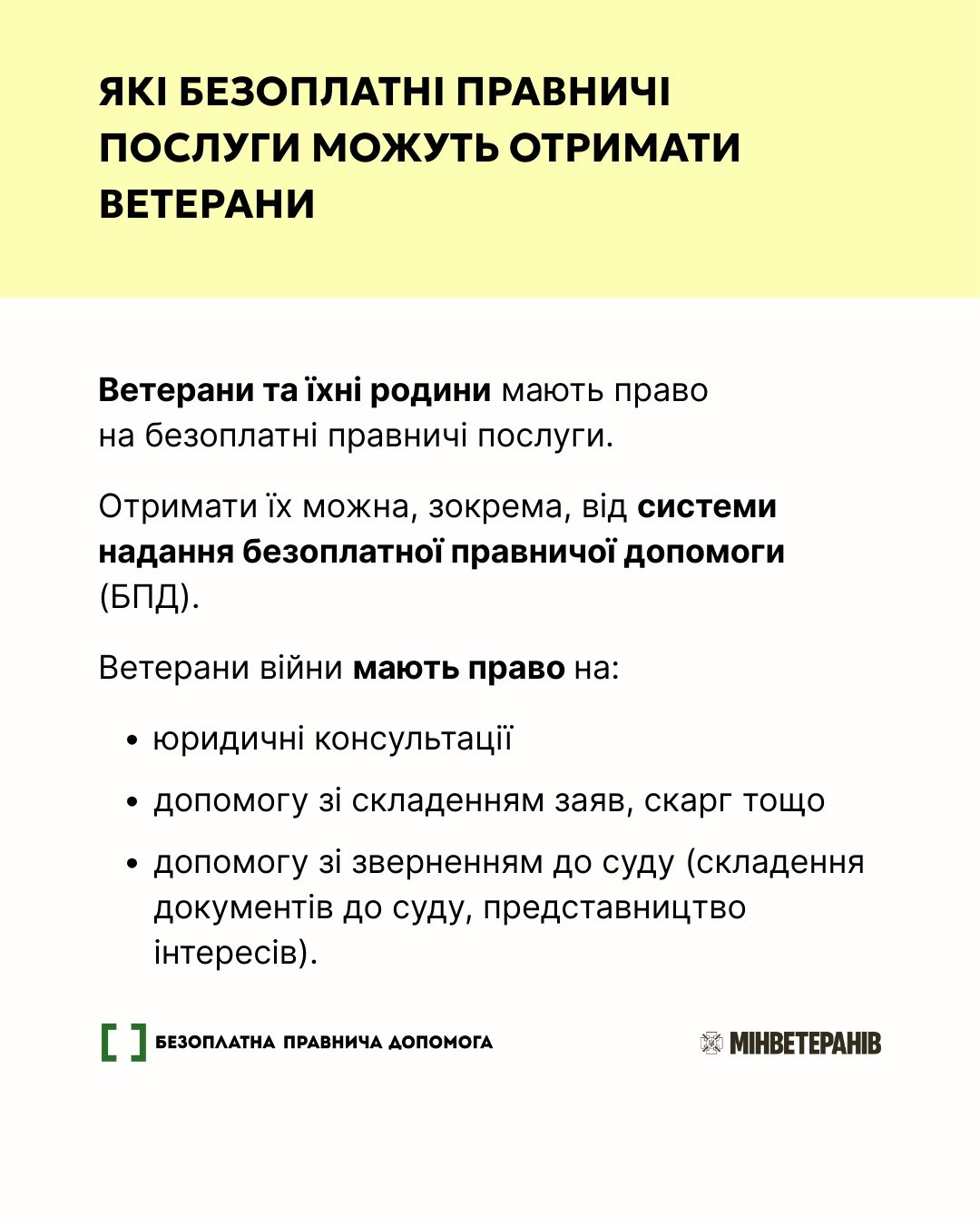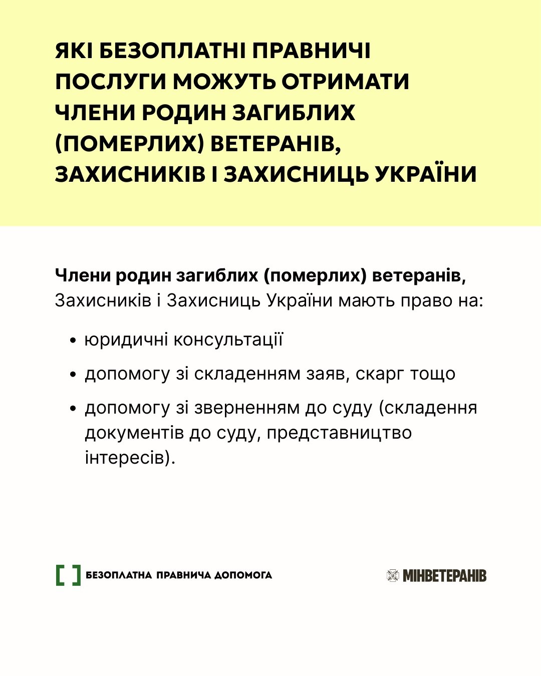 Кожен ветеран і ветеранка, їхні рідні та сім’ї полеглих Захисників і Захисниць мають право на безоплатну правову допомогу від держави.