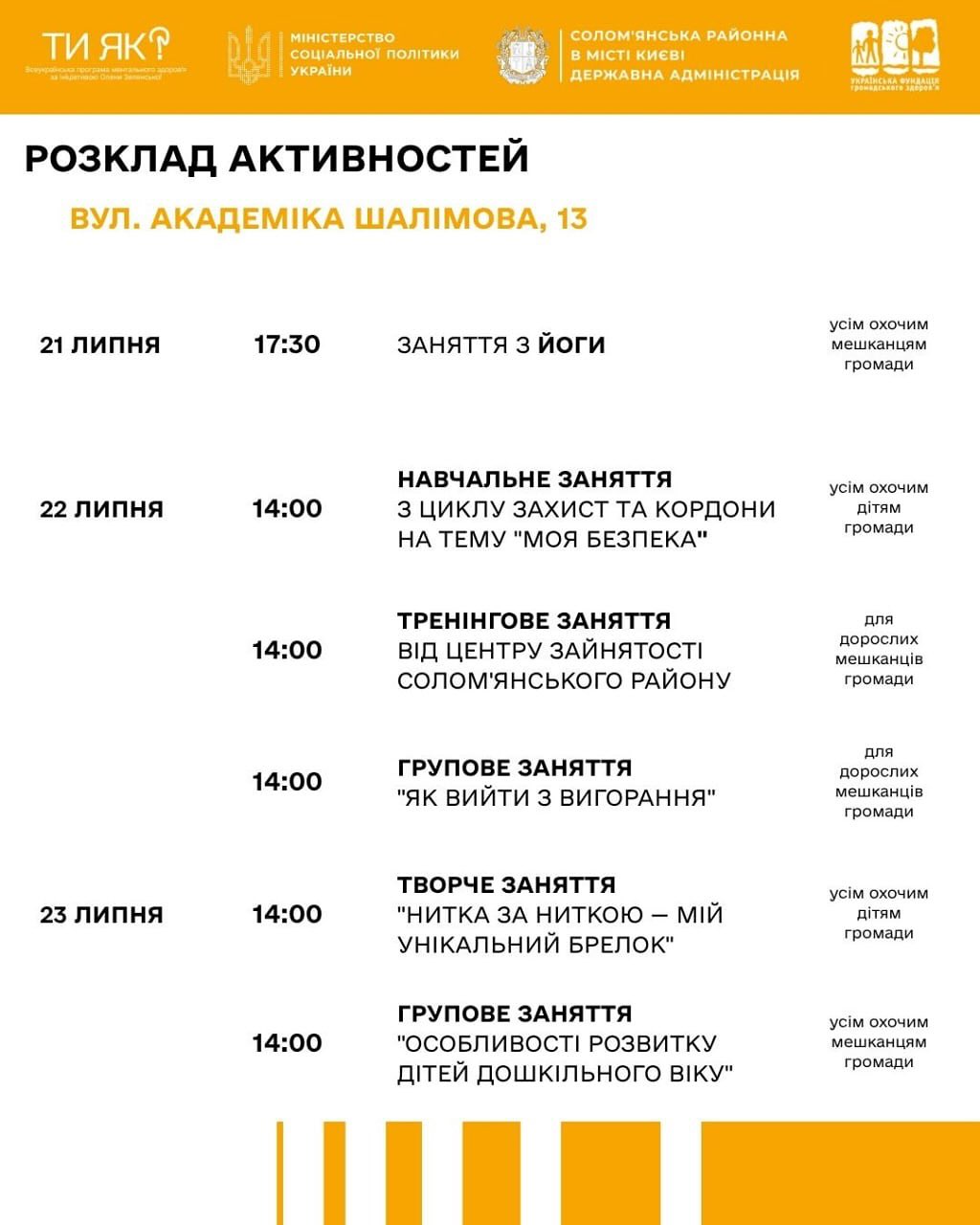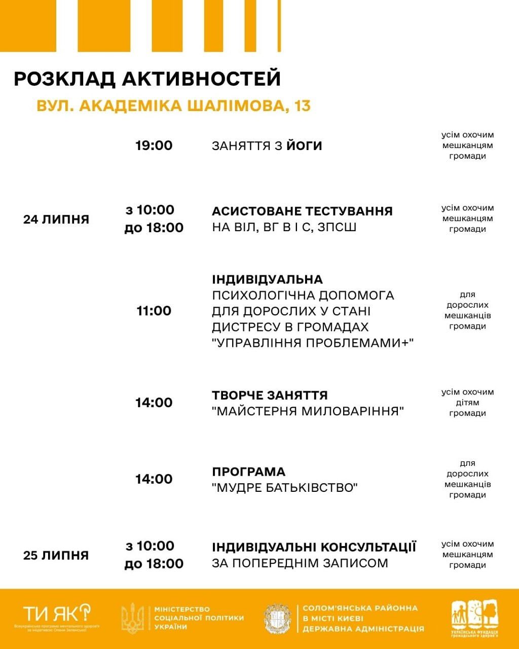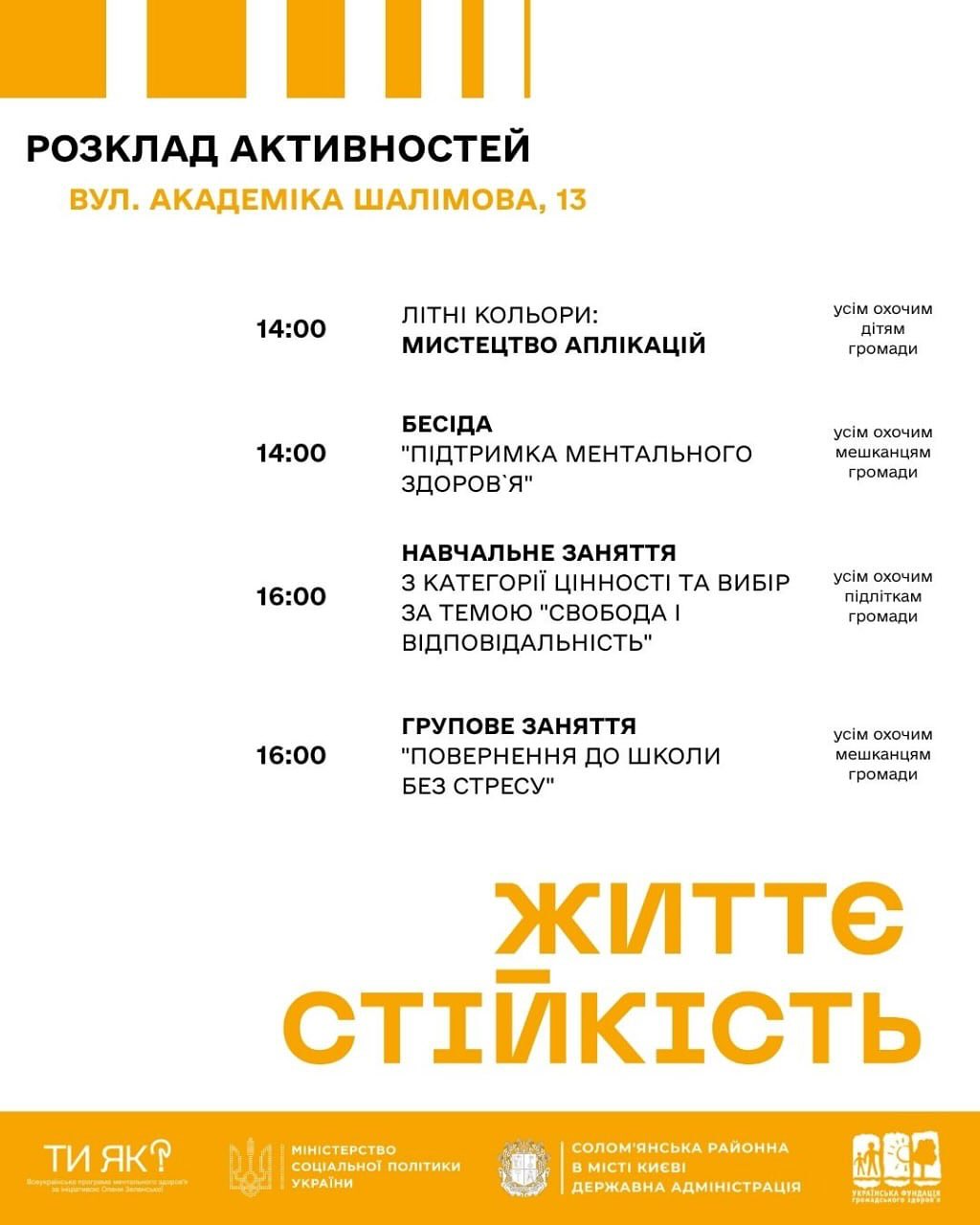 🌞🌻 Центр Життєстійкості у Києві запрошує на щоденні заходи, що допоможуть вам зупинитися, перепочити та знайти внутрішню опору. Ми підготували детальний розклад подій на тиждень, який охоплює різноманітні формати, аби кожен міг знайти щось для себе. Приходьте самі, запрошуйте друзів чи близьких – у нашому центрі панує безпечна, тепла атмосфера, і для кожного завжди знайдеться місце. Наша мета – створити простір для підтримки та відновлення. Відвідування центру – це чудова нагода піклуватися про себе та своє ментальне здоров’я. Ми віримо, що навіть короткий відпочинок може суттєво вплинути на ваше самопочуття та здатність протистояти життєвим викликам. Розклад подій включає різноманітні заняття: від тренінгів з розвитку стресостійкості до сесій з арт-терапії та групових обговорень. Кожна подія ретельно продумана, щоб надати практичні інструменти та емоційну підтримку. Наші спеціалісти завжди готові допомогти та відповісти на ваші запитання. Центр Життєстійкості – це ваша точка опори у сучасному світі. Приєднуйтесь до нашої спільноти та відкрийте для себе новий рівень турботи про себе. Ми розташовані за адресою: м. Київ, вул. Академіка Шалімова, 13. Для зв’язку телефонуйте: +380 93 743 7833. Приходьте, щоб отримати підтримку та відновити сили. Це інвестиція у ваше благополуччя. Ми чекаємо на вас! Наші двері завжди відчинені для тих, хто шукає спокою та підтримки. Відчуйте тепло та безпеку разом із нами.