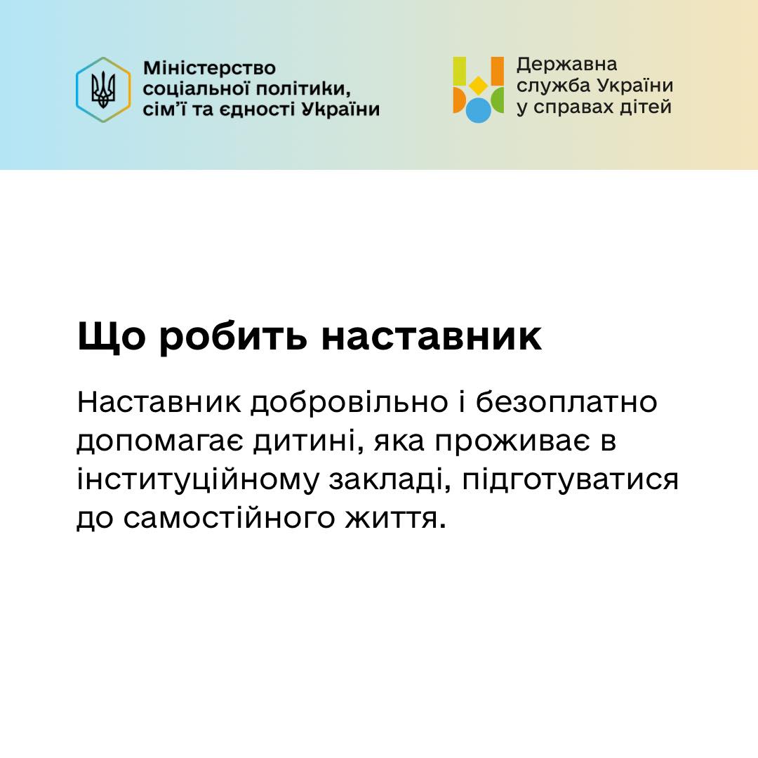 Кожна дитина потребує надійного дорослого поруч. Для дітей, і особливо підлітків, які перебувають в інституційних закладах і готуються до самостійного життя, таким дорослим може стати наставник або наставниця.
