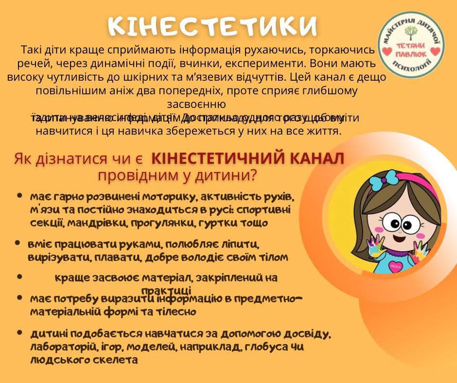 👁👂🏻🖐Кожна людина має свій домінуючий канал сприйняття, за допомогою якого відбувається інтерпретація та обробка зовнішньої інформації. Наш мозок унікальний, і кожен з нас по-різному сприймає світ. Ці канали – це наші основні інструменти для пізнання навколишнього середовища. Вони визначають, як ми отримуємо, аналізуємо та запам’ятовуємо інформацію. Розуміння власного домінуючого каналу сприйняття може значно полегшити комунікацію та навчання. Наприклад, хтось краще засвоює інформацію через слух, хтось – через зір, а хтось – через тактильні відчуття чи рух.