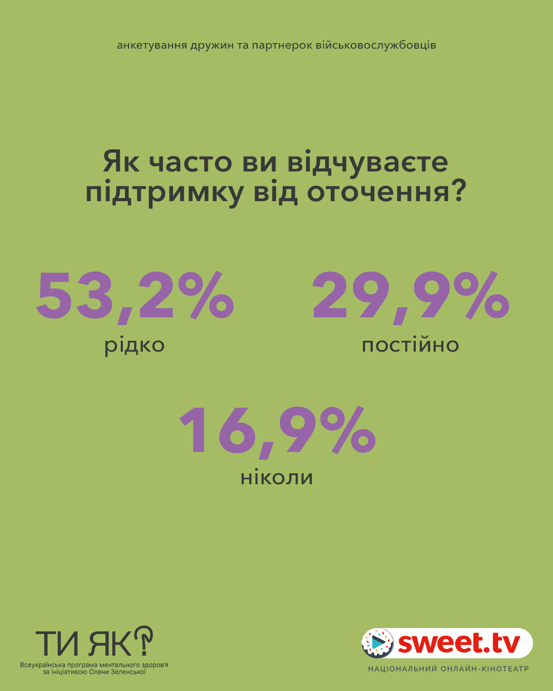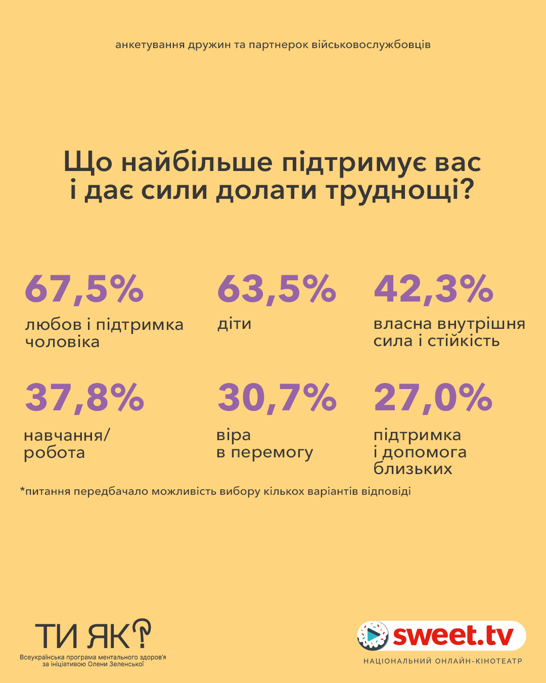 Національний онлайн-кінотеатр SWEET.TV за підтримки Всеукраїнської програми ментального здоров’я «Ти як?» — ініціативи першої леді Олени Зеленської — провів анкетування серед дружин і партнерок військовослужбовців. Його результати — у каруселі 👉