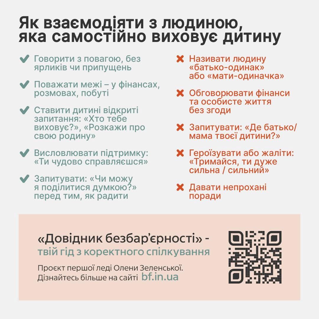 📒 Хочете дізнатися більше про коректну комунікацію з батьками-одинаками? 🔗 Оновлений розділ «Довідника безбар’єрності» від першої леді Олени Зеленської надасть вичерпні поради. Зокрема, там є стаття про те, як правильно спілкуватися з жінками та чоловіками, які самостійно виховують дітей 📲 https://bf.in.ua/ethics/liudyna-iaka-samostijno-vykhovuie-dytynu.