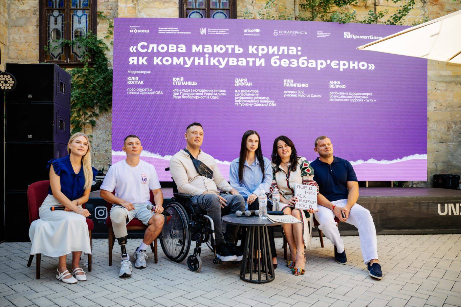 💬 Відбулася панельна дискусія «Слова мають крила: як комунікувати безбар’єрно», в якій взяли участь: Ілля Пилипенко (ветеран ЗСУ, призер «Ігор Нескорених»), Дарʼя Джуган (т.в.о. директора Департаменту цифрового розвитку Одеської ОВА), Юрій Степанець (член Ради з молодіжних питань при Президентові України, член Ради безбар’єрності в Одесі) та Анна Велічко (регіональна координаторка програми ментального здоровʼя «Ти як?»). Модераторкою дискусії виступила Юлія Колтак.