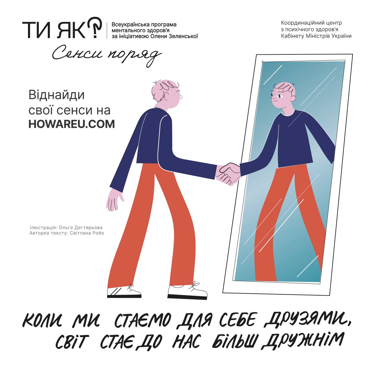 ℹ️ Всеукраїнська програма ментального здоров’я Ти як? – ініціатива першої леді Олена Зеленська, спрямована на розбудову якісної системи надання послуг у сфері психосоціальної підтримки та розвиток культури піклування про ментальне здоров’я.