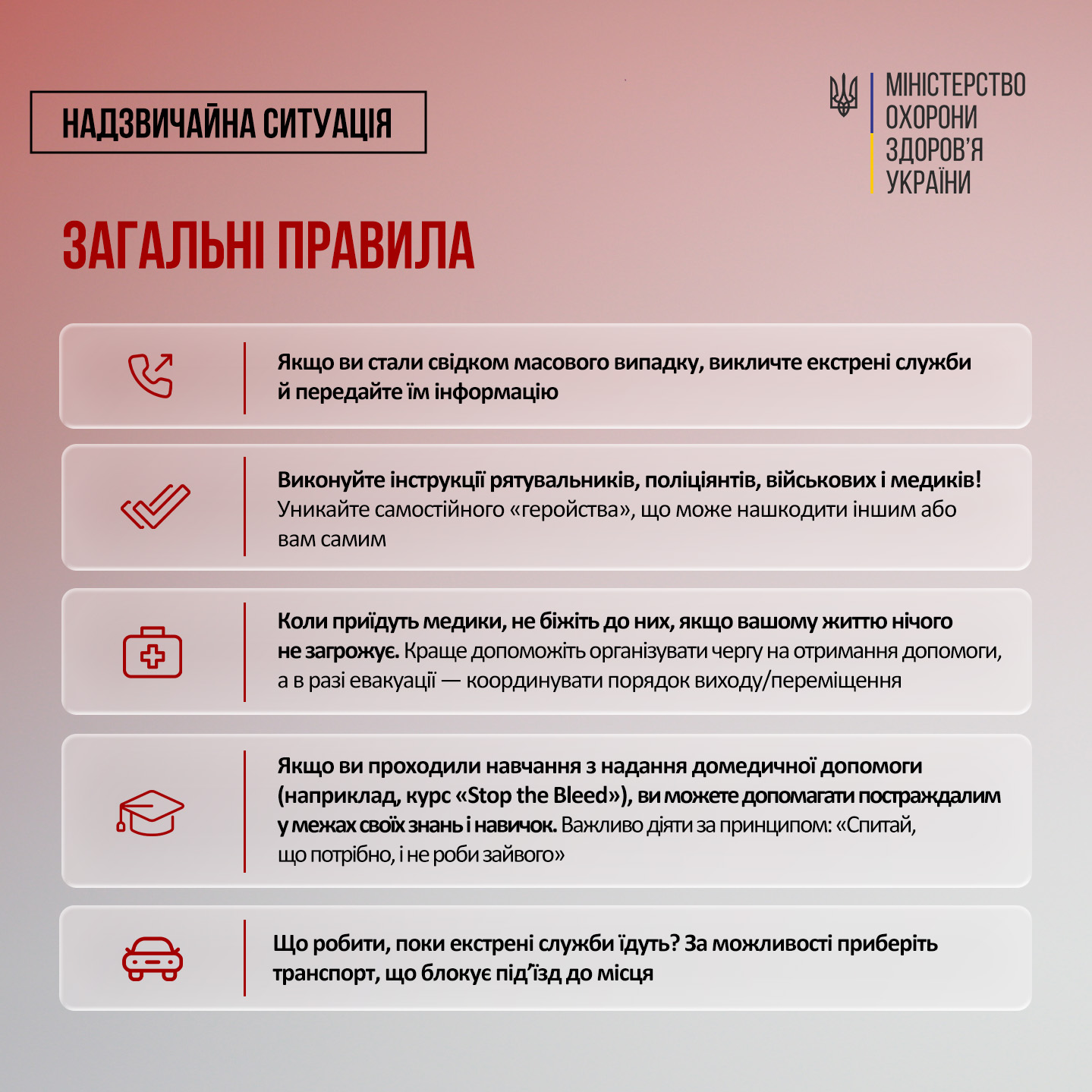 Коли трапляється вибух, пожежа або завал, перша реакція – це природний інстинкт: паніка, розгубленість і бажання діяти або втекти. У таких масових випадках, як надзвичайні ситуації, хаотичні дії свідків можуть завадити професійним рятувальникам, що працюють над порятунком життів.