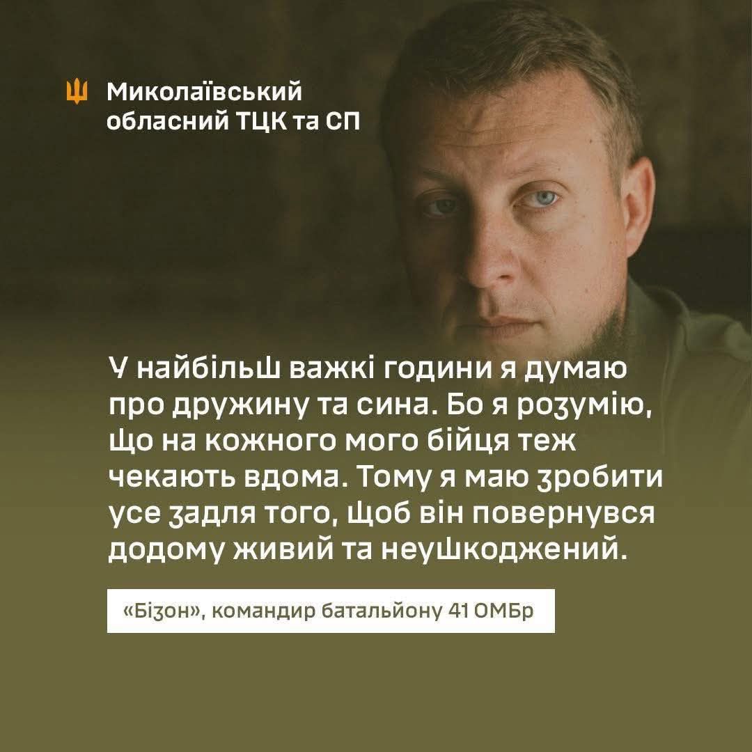 «Справжній командир турбується про своїх підлеглих. Він завжди вислухає, підбадьорить, порадить, підкаже, допоможе. Він перебуває з ними поруч у бою та під час затишшя. Це мій принцип. Цьому я вчу офіцерів. Так тримається повага, міцнішають стосунки між військовослужбовцями, гартується колектив. Це — запорука Перемоги», — розмірковує колишній тренер з важкої атлетики, а нині командир батальйону 41 окремої механізованої бригади із позивним «Бізон».